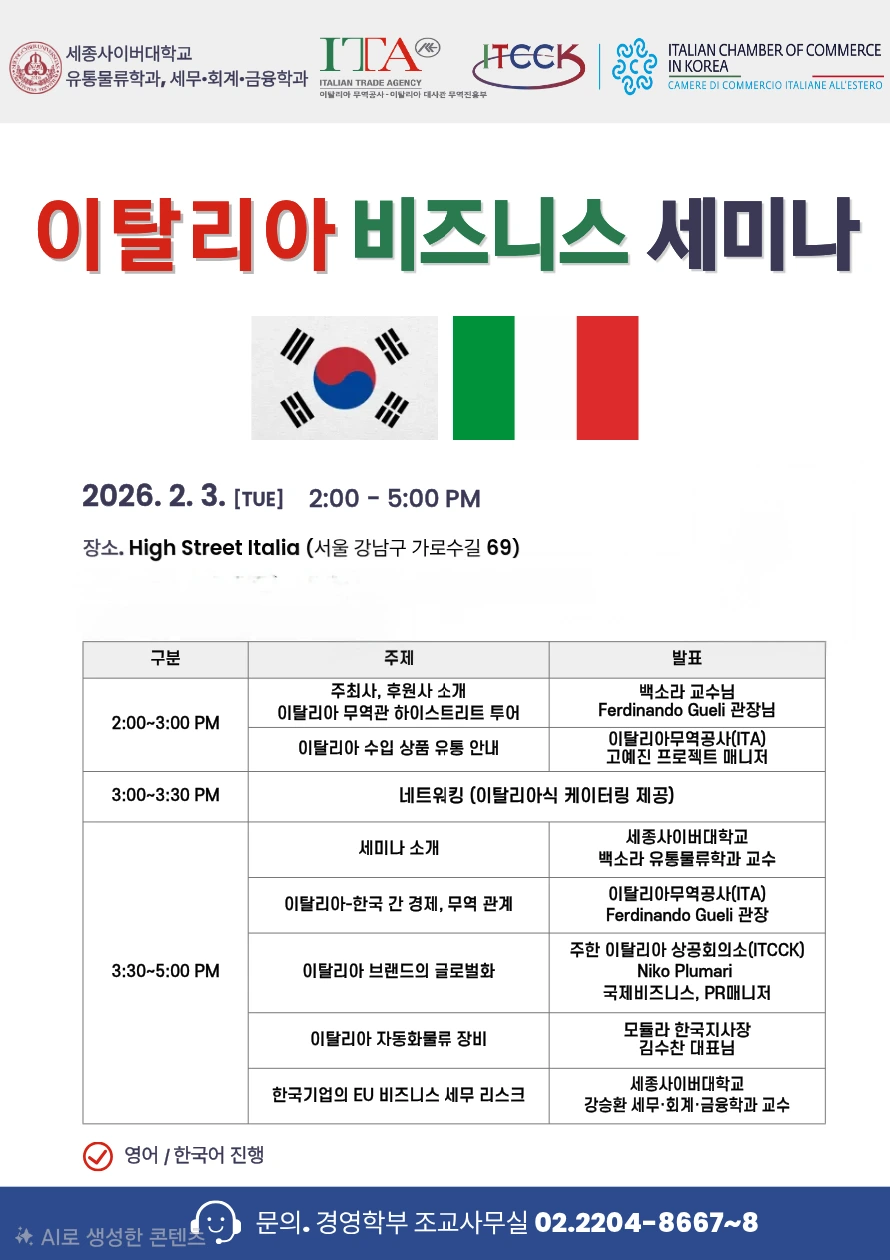주최 : 이탈리아 상공회의소, 이탈리아 무역공사, 세종사이버대학교 유통물류학과