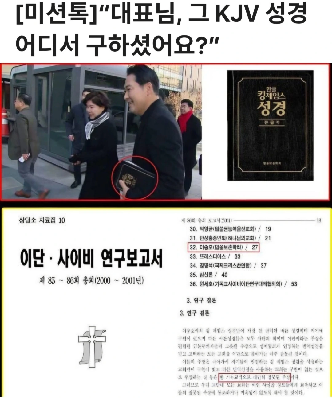 여하튼 정확한 사실관계 확인이 우선이지만, 장동혁 대표는 공당의 대표이기 때문에, 이단ㆍ사이비에 무지해서 그랬다 하더라도 큰 문제이고, 장 대표가 정말 말씀보존학회가 발간한 킹제임스 성경을 믿고 있다면 더 큰 문제라는 지적을 피할 수 없을 것이다.