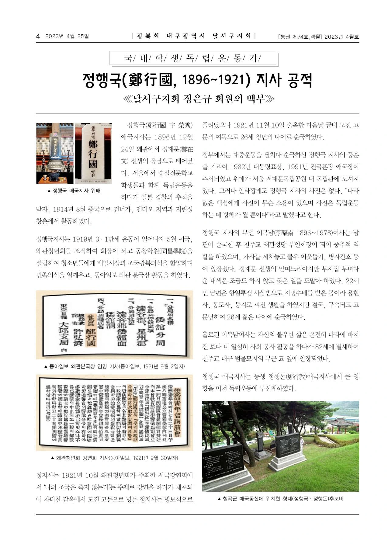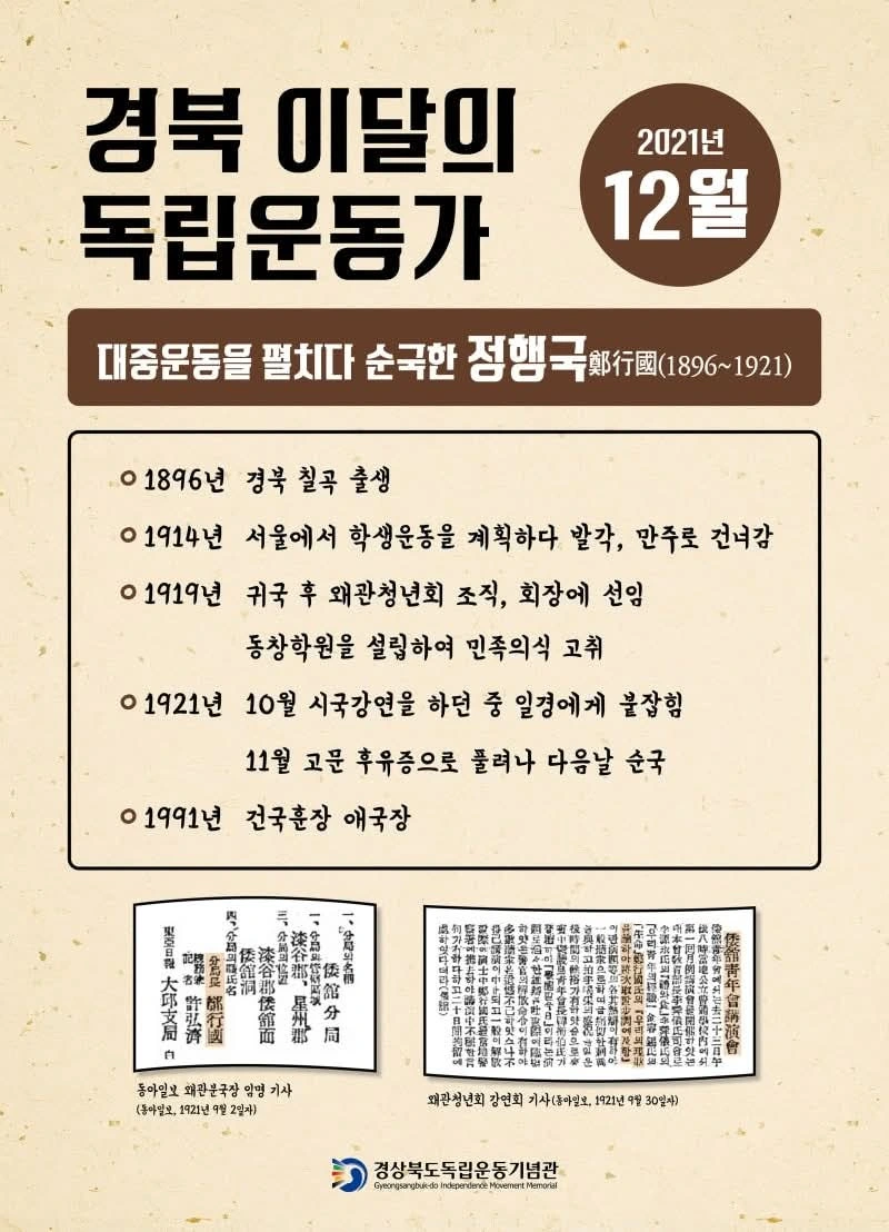 사실 서대문형무소가 내게 특별하게 다가오는 것은 일제강점기 때 학생 신분으로 독립운동하다 감옥에 갇혀 고문 당해 돌아가신 순국선열 애국지사 정행국(鄭行國, 1896년 12월 24일~1921년 11월 11일) 내 큰아버지 위패가 서대문형무소 '독립관'에 모셔져 있는 까닭이다.