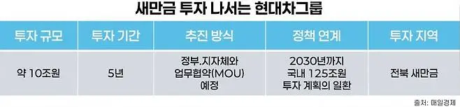 이번에 공개된 투자 내용을 간단히 정리하면 투자 지역은 전북 군산의 새만금 간척지다. 현대차그룹 단독 사업이라기보다는, 산업통상부·기후부·전북특별자치도·새만금개발청 등과 함께 MOU 체결을 준비 중인 것으로 알려졌다. 투자 규모는 ‘수조 원’으로 전해졌고, 추가로 보도된 내용들을 종합하면 향후 5년간 10조 원 규모라는 전망도 나온다. 이는 작년 11월에 공개된 125조 원 규모 국내 투자 계획의 일환으로 해석된다는 관측이 있다.