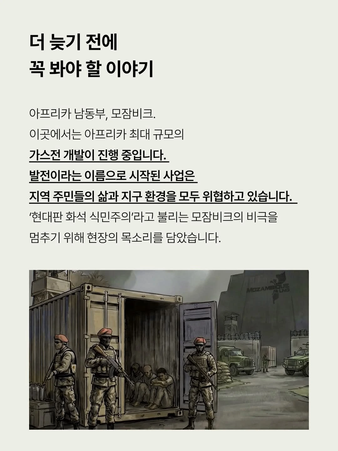 사람들의 땅을 빼앗고 기후를 위협하는 모잠비크 가스전 개발, 정말 우리와 무관할까요?