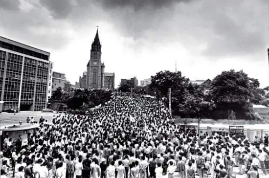 오후 늦게 천주교 안동교구장 두봉 주교의 시국강연이 가톨릭센터 소극장에서 열렸다. 바깥에서는 벌써 간간이 터지는 “독재타도! 호헌철폐!”의 군중들의 함성과 오가는 시위대열의 웅성거림이 입체적으로 들려 왔다. 강연회를 진행하면서도 강연자도 청중도 귀는 토끼처럼 쫑긋 밖을 향하고 있었다.