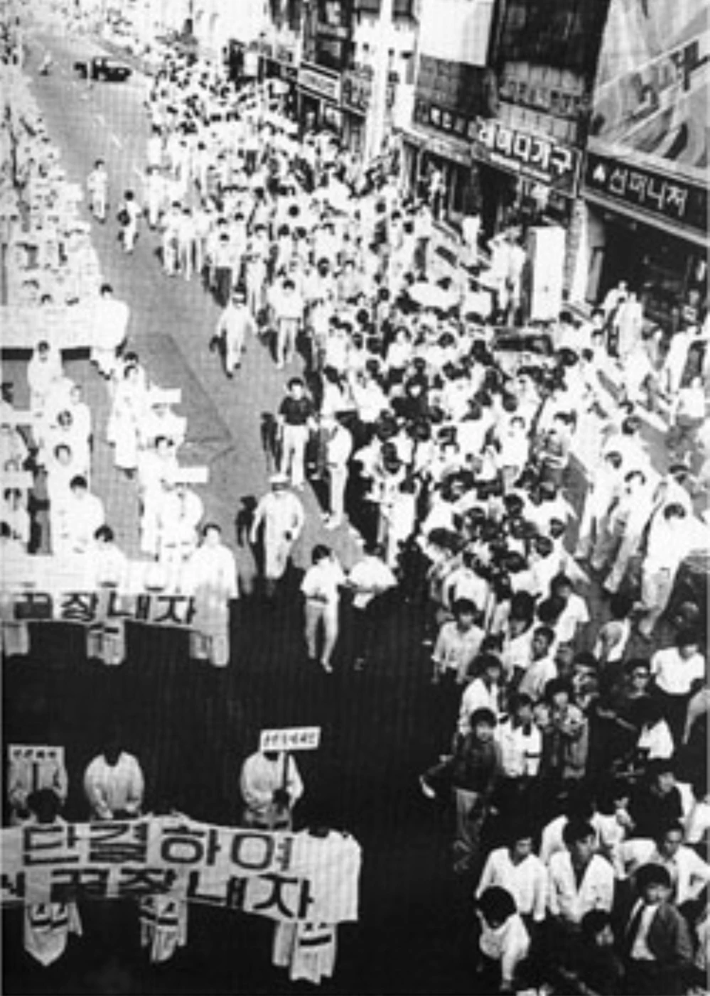 어둠이 깔리자 가톨릭센터 안까지 최루탄이 투척되어 건물 내부가 연기로 자욱해지자 강연회는 중단되고 정문 셔터가 내려져 나는 휠체어를 굴리며 잿빛 거리로 나왔다. 가톨릭센터에서 국제시장으로 향하는 내리막길엔 거리에서 농성하는 이들과 그에 호응하는 시민 학생들이 바리케이드를 쳐주는 진압경찰들에 둘러싸여 하나 가득 운집해 있었고, 즉석 시국집회장은 자발적인 연사들이 나와 독재정권을 성토하고 운동권 노래와 박수와 손수건이 물결 치듯 함께 하며 필승의 전의를 다지는 신명나는 한마당으로 변해 있었다.