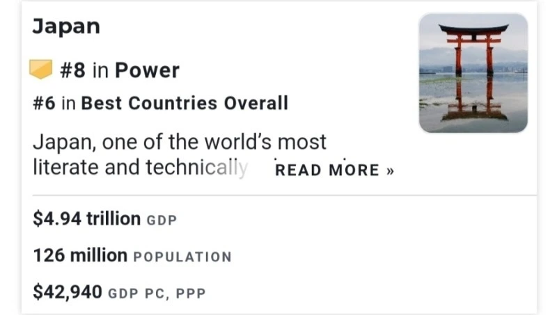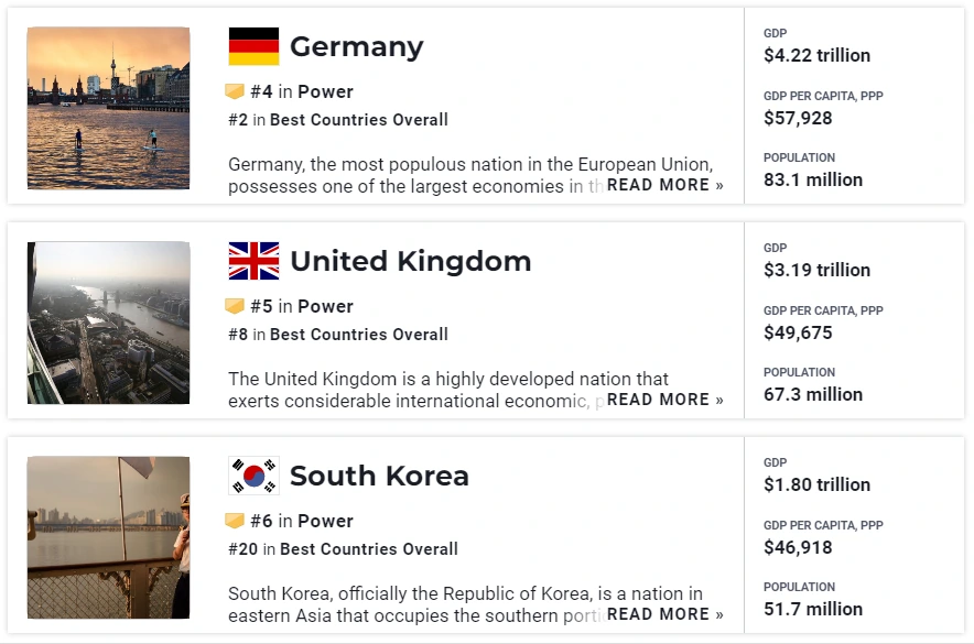 이어 한국이 6위에 이름을 올렸다. 한국의 순위는 지난해 8위에서 2계단 올랐다. USNWR은 "한국의 첨단 기술, 서비스 기반 경제는 외국인 투자 성공 사례로 경제협력개발기구(OECD) 개발원조위원회 기금의 첫 수혜자가 되었고 이후 기금 기부자가 됐다"며 "1960년대 이후 꾸준한 성장과 빈곤 감소를 경험했으며 현재는 전체적으로 세계 최대 경제국 중 하나다. 세계 최대의 국민 총저축(GNS)과 외국인 투자 보유고를 보유하고 있다"고 평가했다.