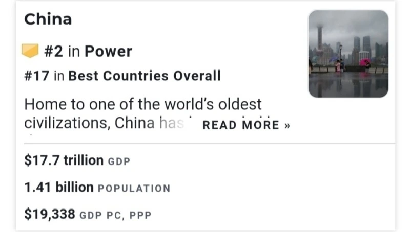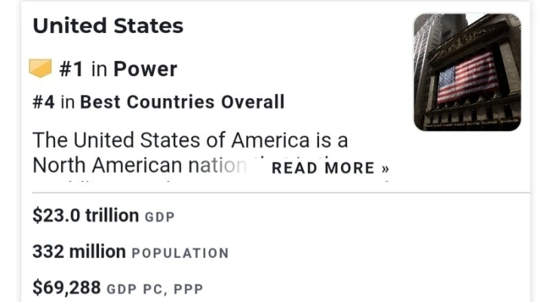 USNWR은 미국에 대해 "세계에서 가장 지배적인 경제 및 군사 강국"이라고 진단했다. 그러면서 "문화적으로도 음악, 영화, 텔레비전으로 표현되는 대중문화의 상당히 큰 부분을 주도하며 전 세계에 영향력을 펼치고 있다"고 밝혔다. 다만 "세계 최강국임에도 불구하고 미국은 여전히 인종적 긴장, 소득 불평등, 점점 더 양극화되는 유권자 등 국내 문제에 직면해 있다"고 평가하기도 했다.