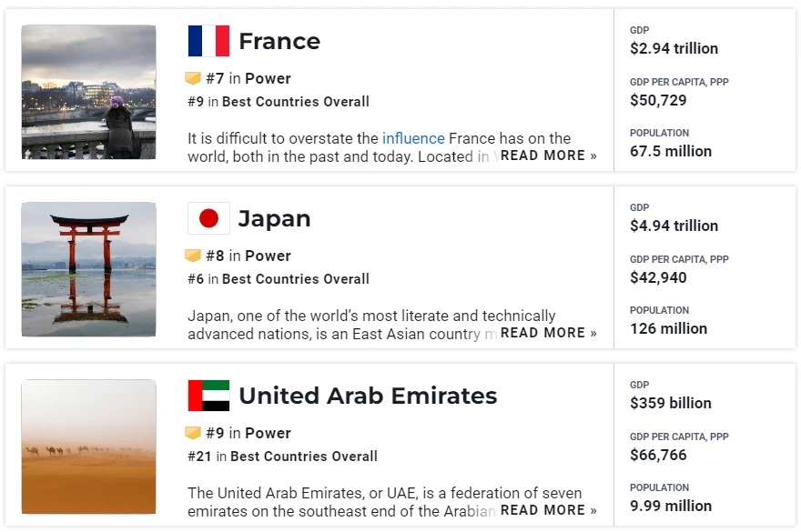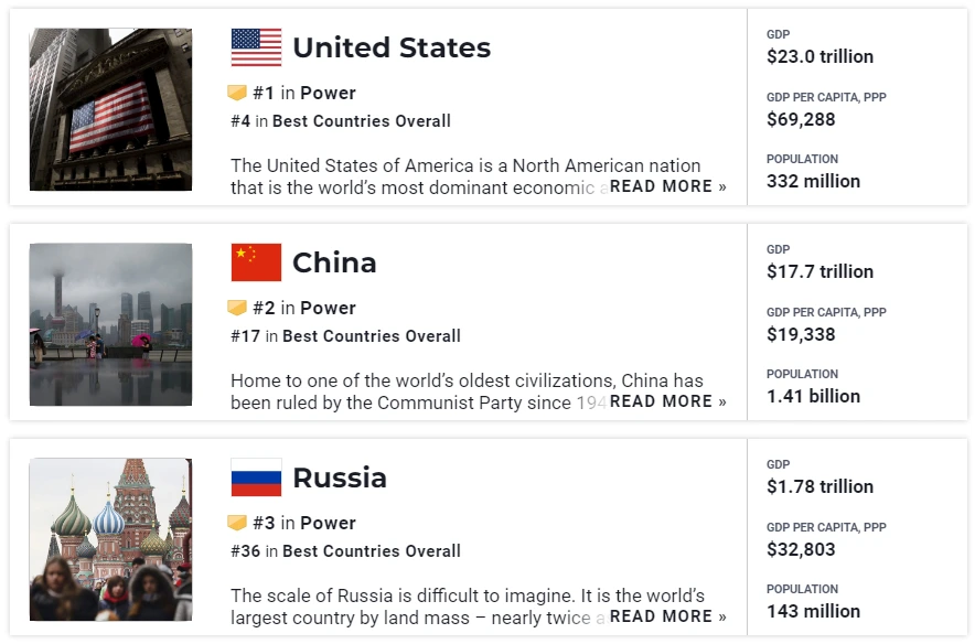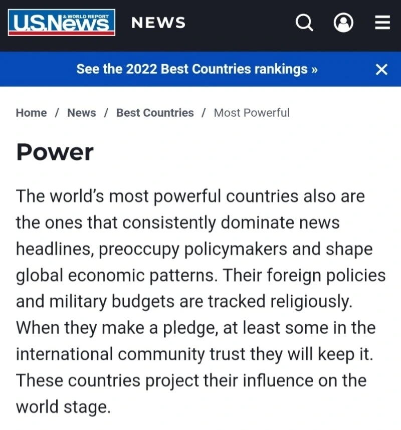 미국 US뉴스앤월드리포트(USNWR)는 지난달 31일(현지시간) 이런 내용의 '2022 세계에서 가장 강력한 국가'(the planet’s most powerful countries) 순위를 발표했다.