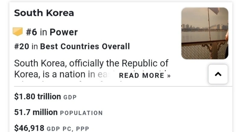 군사력·경제력·외교력 등을 합산해 평가하는 '세계에서 가장 강력한 국가' 조사에서 지난해 한국이 6위를 기록한 것으로 나타났다.