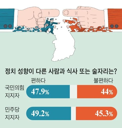 우리 국민 10명 중 4명은 정치적 성향이 다른 사람과는 식사·술자리를 함께하는 것이 불편하다고 여기는 것으로 나타났다. 정치 성향이 다르면 본인이나 자녀의 결혼이 불편하다는 답도 43%에 달했다. 조선일보가 케이스탯리서치에 의뢰해 지난 12월 26~27일 1022명을 대상으로 실시한 신년 특집 여론조사 결과다. 선거 때 수면 위로 드러났던 정치적 양극화가 우리 일상까지 지배하며 국가적 리스크로 떠올랐다.