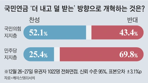 지난 3·9 대선 때 여야 후보 모두가 동의한 ‘국민연금 개혁’을 두고도 여야 지지자들의 찬반이 갈렸다. 전체 응답자 가운데 찬성은 36.2%, 반대는 56.1%인데, 국민의힘 지지층 사이에서는 찬성이 52.1%로 반대(41.5%)보다 10.6%포인트 높았다. 민주당 지지층은 반대가 69.8%로 찬성(25.4%)보다 44.4%포인트 높았다. 국민연금은 ‘더 내고 덜 받는’ 형태로 개혁하지 않으면 2057년쯤 고갈될 것이라는 예측이 이미 나와 있다. 여야도 이런 취지에 공감해 국민연금 등 4대 공적 연금 개혁을 위한 국회 연금개혁특위를 지난 7월 구성했다. 하지만 민주당은 윤석열 정부가 연금을 노동·교육과 함께 ‘3대 개혁’ 과제로 선정해 추진에 나서자 호응하기보다 관망하는 태도를 보이고 있다. 민주당 지지층 70%가량이 국민연금 개혁에 반대하는 데는 민주당의 이 같은 태도가 영향을 줬다는 분석이 나온다.