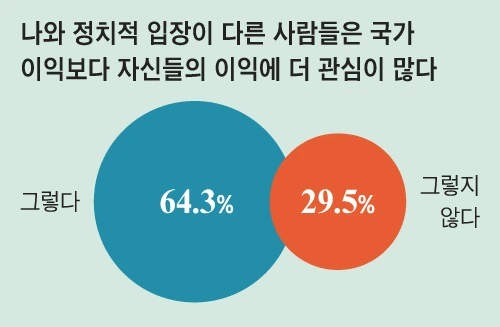 이번 조사에서 ‘나와 정치적 입장이 다른 사람들은 국가의 이익보다는 자신들의 이익에 더 관심이 많다’는 의견에 ‘공감한다’는 응답자는 64.3%로 나타났다. ‘공감하지 않는다’는 29.5%였다. 이 의견에 공감한다는 응답은 보수와 진보 성향이 각각 66.7%와 71.1%로, 중도 성향(56.6%)보다 높게 나타났다. 3명 가운데 2명꼴로 자기와 정치적 입장이 다른 상대 진영을 ‘사익을 우선하는 사람들과 집단’으로 바라보고 있다는 것이다.