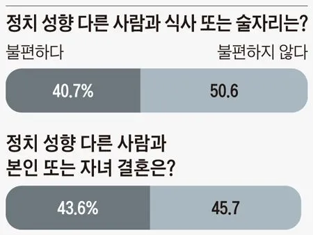 이 조사에선 ‘정치적인 성향이 다른 사람과 식사 또는 술자리가 불편하다’는 응답이 40.7%로 절반에 육박했다. ‘정치적 성향이 다른 사람과 본인 또는 자녀의 결혼’에 대해서도 ‘불편하다’가 43.6%였다. 지지 정당이 다른 사람과 결혼 관계를 맺는 게 ‘불편하다’는 응답은 여야 지지층 모두 각각 44.5%와 47.9%로 비슷했다. 성별로는 남성(36.9%)보다 여성(50.2%)이 더 높았다. 연령별로는 20대(49.3%)에서 가장 높았고 70대 이상(33.3%)에서 가장 낮았다. 전문가들은 “미국에선 지지 정당이 같으면 데이트 상대나 배우자를 선택할 때 매력을 증가시키는 효과가 있다는 연구 결과가 있다”며 “우리도 정치 성향이 가족과 교우 관계에 점차 영향이 커지고 있다”고 했다.