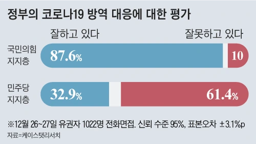 정부의 코로나 방역 대응을 둘러싼 여야 지지자들의 평가는 정권이 교체된 1년 사이에 정반대로 바뀌었다. 지난 12월 26~27일 실시된 케이스탯리서치 조사에서 정부의 코로나 방역 대응에 대해 국민의힘 지지자들의 긍정과 부정 평가는 각각 87.6%와 10%였고, 민주당 지지자들의 긍정과 부정 평가는 각각 32.9%와 61.4%였다. 문재인 정부 때인 지난해 1월 실시된 한국갤럽 조사에서는 정반대의 결과가 나왔다. 당시 국민의힘 지지자들의 긍정과 부정 평가는 각각 24%와 63%였다. 민주당 지지자들의 긍정과 부정 평가는 각각 84%와 13%였다. 지난해 5월 10일 윤석열 정부가 출범한 이후 방역 정책의 근본적 변화는 없었지만, 여야 지지자들의 평가는 극단적으로 뒤바뀐 것이다.