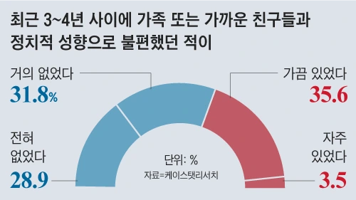 조선일보가 케이스탯리서치에 의뢰해 실시한 여론조사에서는 10명 중 4명(39.1%)이 ‘3~4년 내 정치적 성향으로 가족·친구와 불편함을 경험했다’고 답했다. 나이별로는 40대와 60대에서 45.8%로 높았고, 성별로는 남성(36.2%)보다 여성(41.9%)에서 불편을 경험한 비율이 높았다. 경남 지역의 한 초등학교 동문회는 매년 개최하던 송년회를 지난해 일주일 앞두고 취소했다. ‘동문회 채팅방에서는 정치적 의견 표명을 자제한다’는 룰이 있지만 일부 동문들이 대장동 사건과 관련된 친야(親野) 성향 동영상을 이틀에 한 번꼴로 올리자 “그만해라” “네가 뭔데 이런 말도 못 하게 하느냐”며 동문 간 싸움으로 번졌기 때문이다.