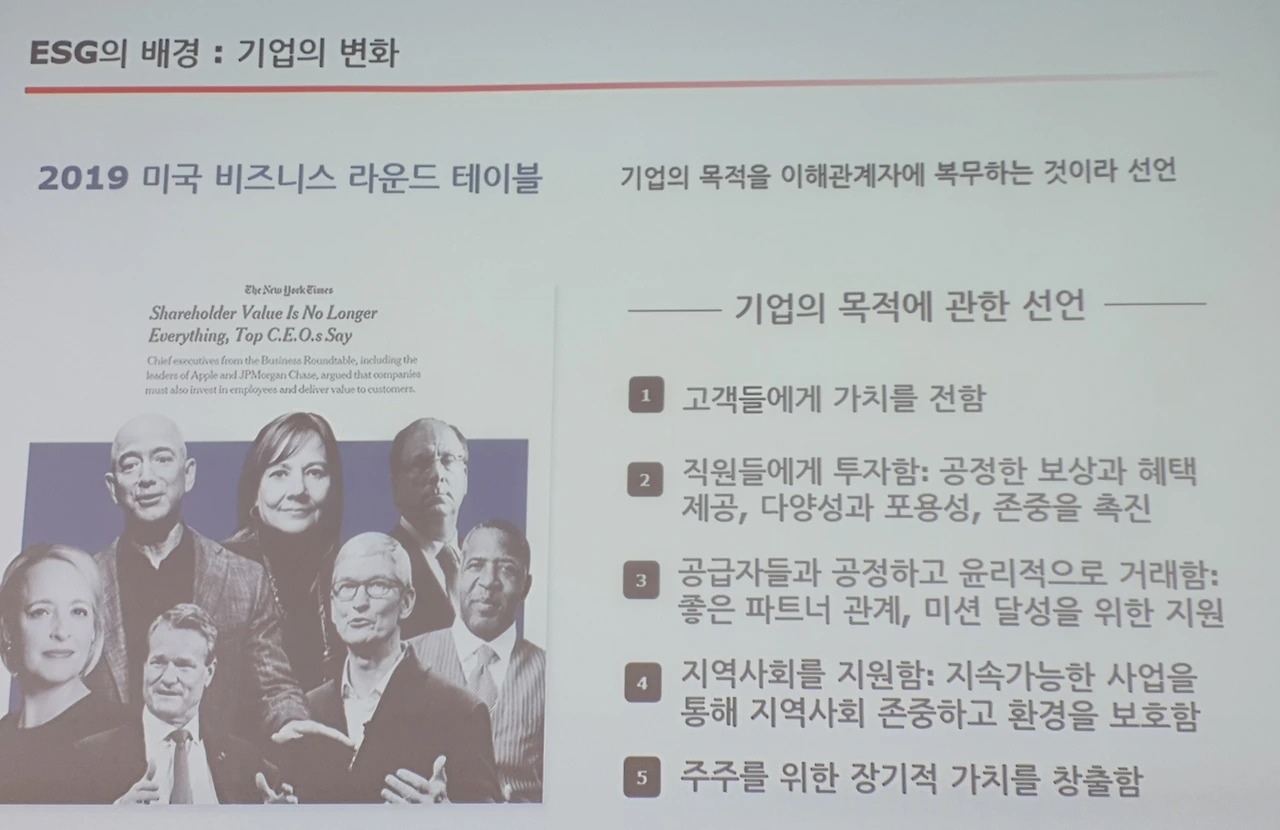 빌 게이츠는 우리가 매년 배출하는 온실가스 510억t을 0으로 줄여야 한다고 주장한다. 아웃도어 회사인 파타고니아는 ‘지속 가능성’으로 충분하지 않다며 ‘지구를 되살리는 것’을 목표로 삼고 있다. 지구가 목적이고 사업은 수단이다. 미국의 대기업 협의체인 BRT는 2019년 ‘기업의 목적에 관한 선언’을 발표했다. 주주를 위한 눈앞의 이윤만 추구하지 않고 근로자와 고객, 협력업체, 지역사회 등 이해관계자를 고려하는 근본적 책무를 이행하겠다는 것이다. 이를 두고 주주 자본주의의 종식, 포용적 자본주의로의 전환이라는 보도가 이어졌다. 다보스 세계경제포럼에서도 비즈니스가 ‘이해관계자 자본주의’를 전적으로 받아들여야 한다는 논의가 이어졌다. 한국 기업 중에는 경제적 가치와 함께 사회적 가치를 추구하고, 이해관계자의 행복을 도모한다는 내용으로 정관을 고친 사례도 있다.