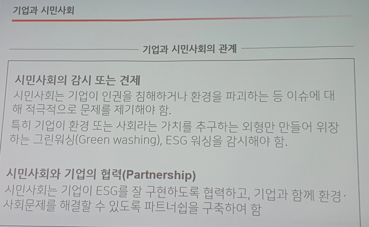 과거 기업은 환경과 사회문제를 일으키는 존재라 여겨졌고, 시민사회의 비판과 감시의 대상이었다. 기업과 시민사회는 서로 거리를 두었다. ESG 시대에서는 기업과 시민사회의 관계도 바뀌어야 한다. 물론 시민사회는 기업을 견제하고 기업이 인권을 침해하거나 환경을 파괴하는 이슈에 대해 적극적으로 문제를 제기해야 한다. 기업이 환경 또는 사회라는 가치를 추구하는 외형만 만들어 위장하는 그린워싱(Green washing), ESG 워싱을 시민사회는 감시해야 한다. 그러나 이러한 견제와 함께 협력도 요구된다. 시민사회는 기업이 ESG를 잘 구현하도록 돕고, 기업과 함께 환경·사회문제를 해결할 수 있도록 협력해야 한다.