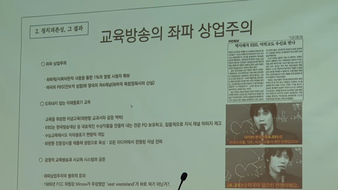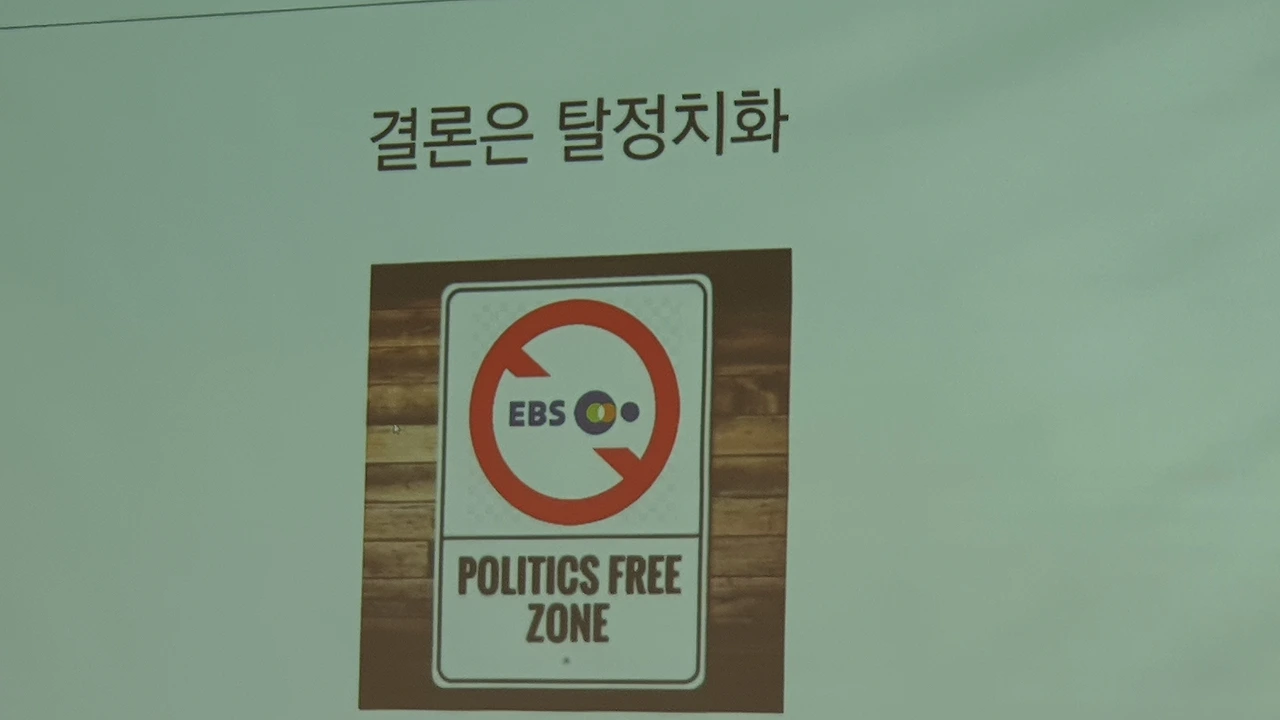 황근 교수는 “사회주의 진영 사전에 보면 교육과 프로파간다가 같이 나와 있다. 교육과 선동은 방법만 다른 것이지 똑같은 이데올로기 주입 방식 중에 하나”라며 “우파는 교육방송의 역할을 상업방송의 보완이라고 생각한다. 반면 좌파는 민주시민을 중요한 교육적 개념으로 생각하니까 상대적으로 교육방송 하시는 분들 입장에선 좌파가 자기들에게 우호적이라고 생각한다. 이렇게 하다 보니까 결국 EBS가 좌파의 전유물이 된 것”이라고 했다.