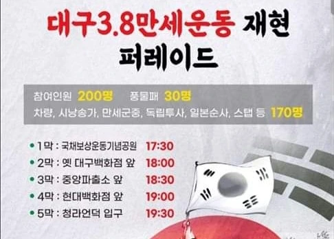 - 대구의 역사정신..현대사의 길목마다 민족과 국가의 미래를 위해 애국애족의 큰 역할 했던 대구, 하지만 박정희 전두환 노태우 박근혜 네 '보수' 대통령을 배출하며 기득권 세력의 본거지로 내몰리면서 그 역사정신마저 아득한 기억 속으로 사라지게 되었던 것이다. 어제 만세운동 재현 퍼레이드에 만세를 부르는 독립운동가 퍼포먼스하면서 내 피 안에 스며있는 대구의 그 역사정신을 새겨보지 않을 수 없었다. 이제 내 고향 대구가 그 역사정신으로 새롭게 태어날 때가 되었다.