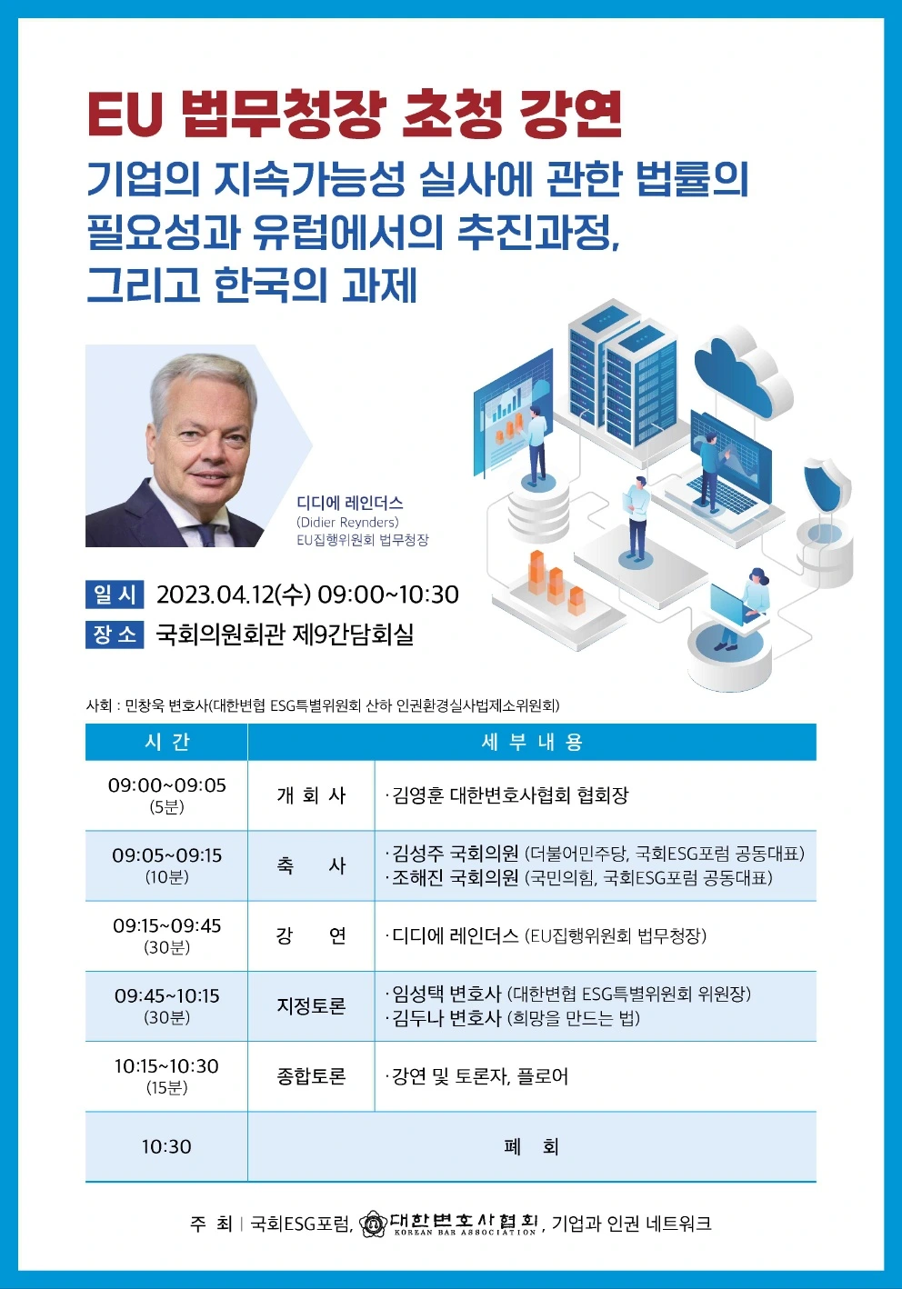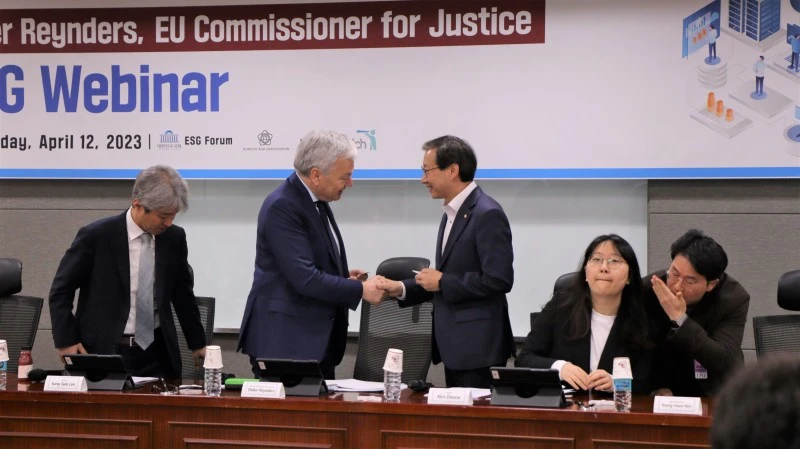 이날 디디에 레인더스 법무청장은 EU 「기업 지속가능성 실사 지침」의 입법 추진 경위, 목적과 내용, 제3국 기업에 미치는 효과 등을 상세히 소개했다. 레인더스 법무청장은 “이 지침은 기업이 글로벌 공급망 전반에서 비즈니스 활동을 운영하는 방식을 전환하는 ‘게임 체인저’(game changer)가 될 것”이라고 밝혔다. 공급망 실사를 통해 기업의 지속가능성을 제고하고 인권 및 환경위험을 예방ㆍ방지하려는 EU의 입법 과정은 한국정부 및 기업들에게도 시사점이 될 것이다.