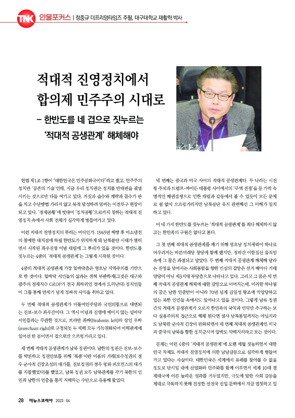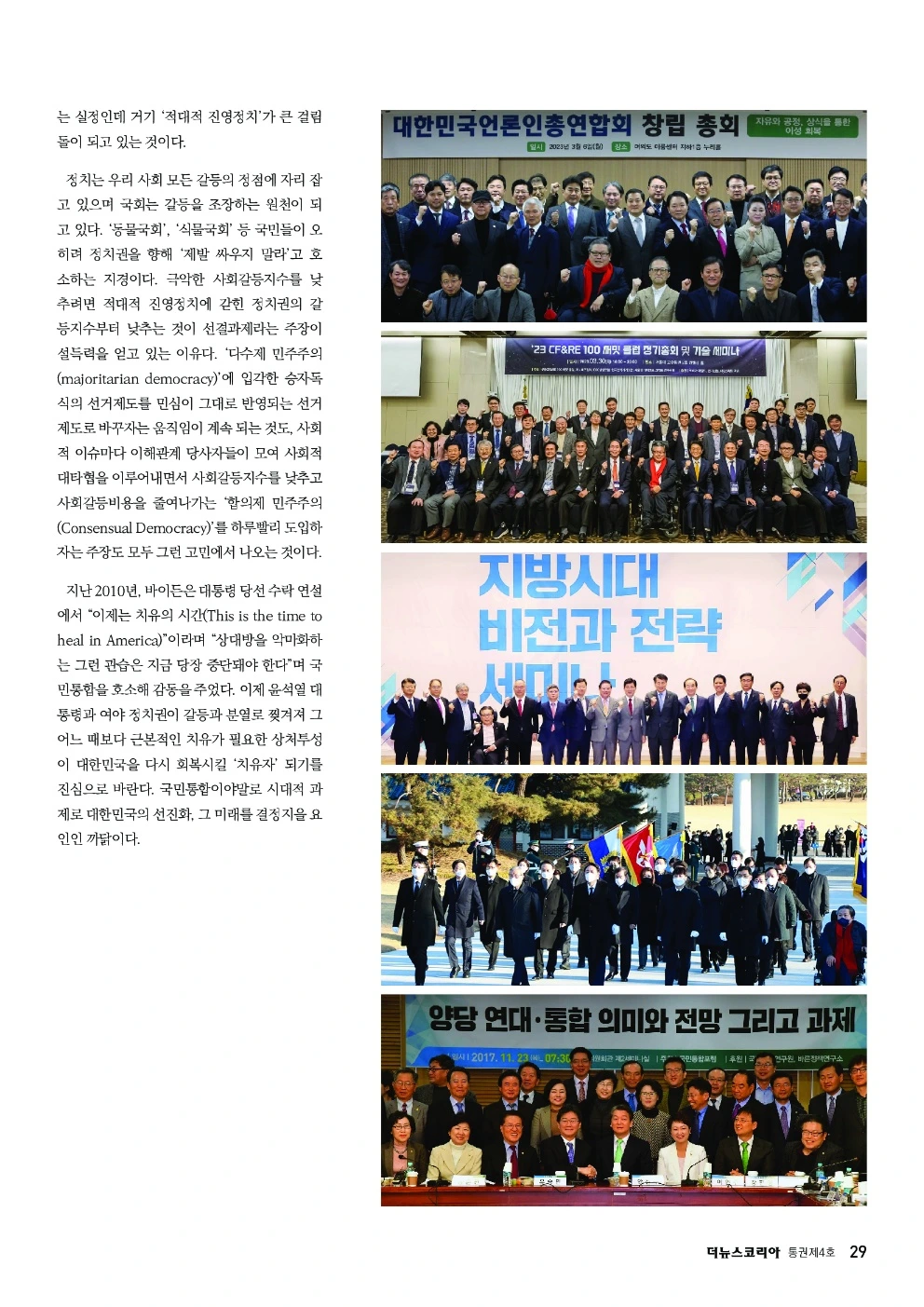 <더뉴스코리아>는 이번 4월호에 제가 '적대적 진영정치에서 합의제 민주주의 시대로'라는 제하의 정치평론을 아래와 같은 내용으로 게재했던 월간지이기도 합니다.