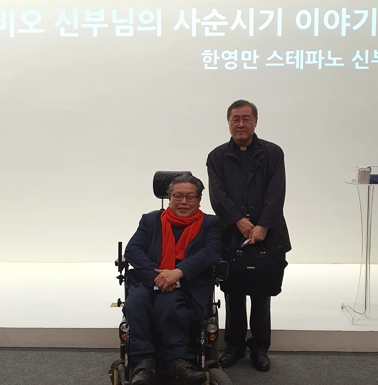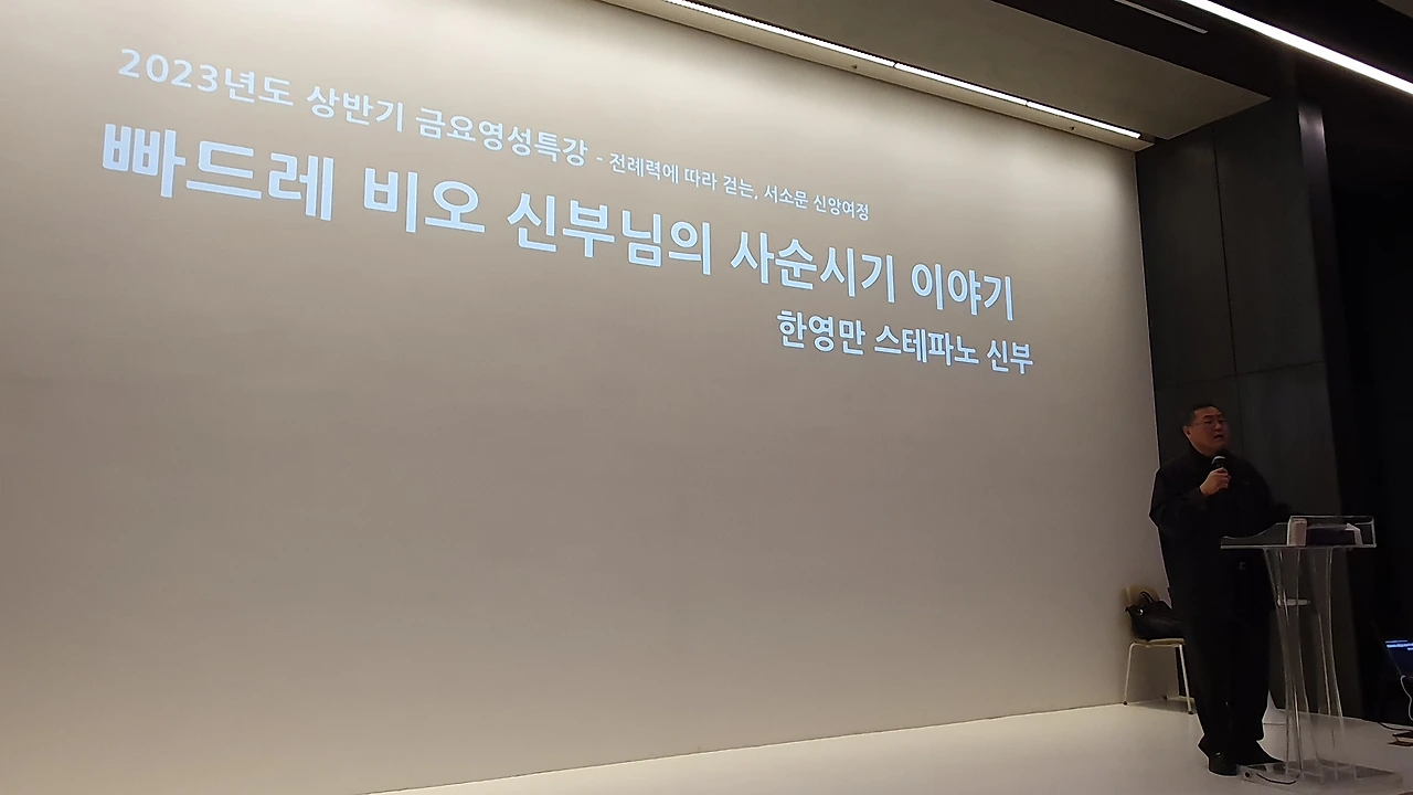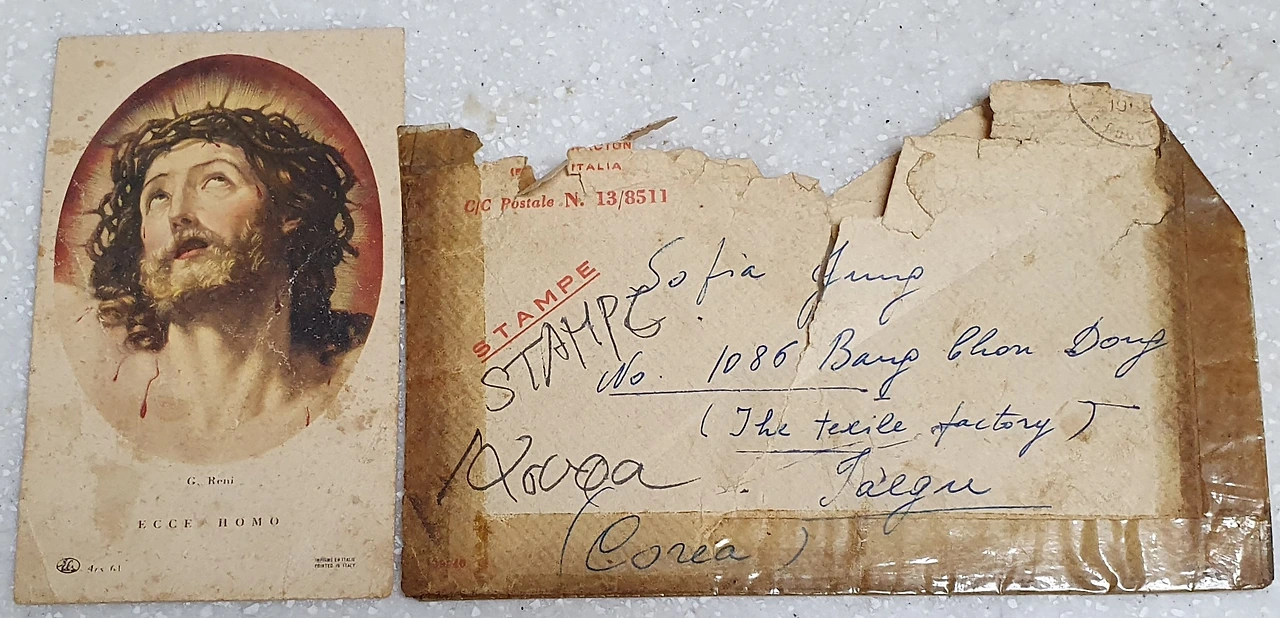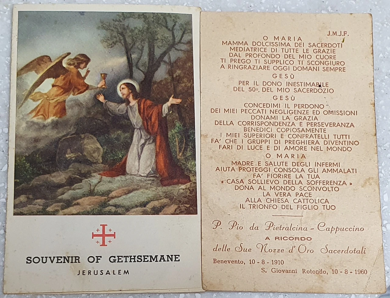 - 오상(五傷)의 성 비오 신부님(Sanctus Pius de Petrapulsina, 1887년 5월 25일 - 1968년 9월 23일)은 생전에 나하고도 인연이 있었다. 내가 첫돌을 앞두고 소아마비에 걸려 장애를 입게 되자 마침 프랑스 유학 중이셨던 외삼촌 신부님께서 안타까운 심정에 비오 신부님을 찾아가 기도와 말씀을 부탁드렸다. 그러자 그분께서 "하느님께 봉헌드리고 푸른 옷을 즐겨 입혀라"는 말씀을 주시고, 직접 대구 내 집으로 아래 사진에서처럼 예수께서 기도하셨던 게세마니 동산의 올리브잎과 바위 조각이 박힌 예수님 상본을 동봉해 편지를 보내주셨다. 60년도 더 된 오랜 세월 이야기다. 그러곤 그분은 내 나이 열 살 때 소천하셨고 2002년 교황 요한 바오로 2세에 의해 성인품에 오르셨다. 그분의 말씀은 내 인생 전체를 관통하는 화두가 되었고, 스스로를 나지르인인양 여기게 만들었다. 오늘 강론을 들으며 반세기 전 그때 그 시절로 돌아가는 느낌에 감회가 새롭기만 했었다.