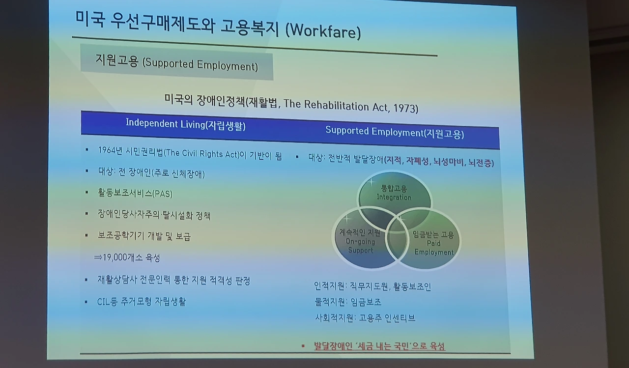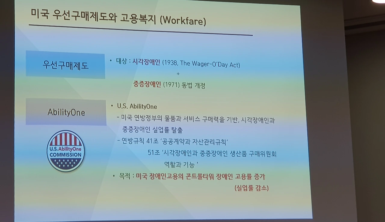이번 토론회의 기조발제자인 나사렛대 명예교수인 김종인 박사는 ‘중증장애인생산품 우선구매제도를 통한 중증장애인 고용복지의 혁신방안’라는 발제에서, 미국의 우선구매제도 설명하며, 미국의 재활법이 중증신체장애인에게는 자립생활을 위해 활동지원사를 지원한 것에 비해 ‘우선구매제도’는 지적장애·자폐성장애·뇌성마비·뇌전증 등 전반적 발달장애인에게 Job Coach와 함께 부족한 최저임금을 보존해 주어 발달장애인 지원고용(Supported Employment)기회를 주는 제도로서, ‘우선구매’와 ‘지원고용’ 두 제도를 통해 시각장애인과 신체적 중증장애인·발달장애인 등의 고용과 소득보장을 하는 고용복지(Workfare)로 작년의 우선구매 결산액이 40억불(5조 4천억원)에 이르렀다고 설명하면서, 우리의 경우에는 2000년부터 장애인생산품판매시설을 운영해 오다 2008년 ‘중증장애인 우선구매 특별법’을 시행하면서 장애인직업재활시설(1%), 장애인표준사업장(0.34%)의 우선구매 비율을 정하여 장애인생산품의 판매를 높여나가기만 하는 제도로 작년 우선구매실적 7005억 원이었다며, 이번 토론회를 기점으로 ‘중증장애인생산품 우선구매제도’와 ‘고용제도’(의무고용제도와 고용장려금) 등을 융합·연계하여 중증·발달장애인의 고용기회와 소득 보장의 고용복지제도(Welfare에서 Workfare로)로 혁신해야 한다고 주장하였다.