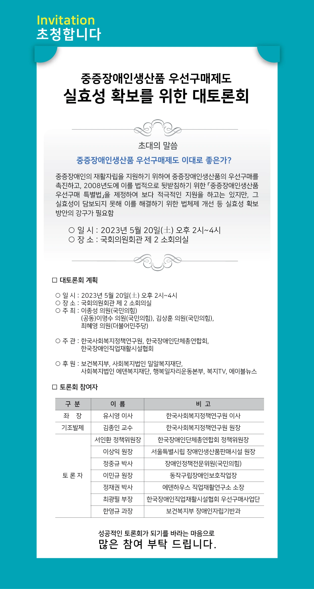 120명 좌석에도 150여명의 인원이 성황리에 참여한 이번 토론회는 국민의힘 이종성 의원이 주최하고, 이명수 의원, 김상훈 의원과 더불어민주당 최혜영 의원이 공동개최하였으며, 이를 한국사회복지정책연구원이 주관하고, 한국장애인단체총연합회와 한국장애인직업재활시설협회가 공동으로 주관하였다.