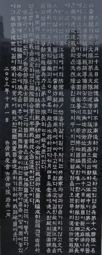 오호라! 장하도다! 백골부대 용사들이여! 그대들의 분전(奮戰)은 한강방어 임무를 완수하는데 기둥이었다! 백척간두에 섰던 조국의 운명에 서광을 비추게 하고 국제연합군이라는 튼튼한 동아줄을 이 땅에 묶어 놓았다 그 전공을 후세에 길이 전하고 이곳에서 전사한 호국영령들을 추모하기 위하여 전적비를 세운다.