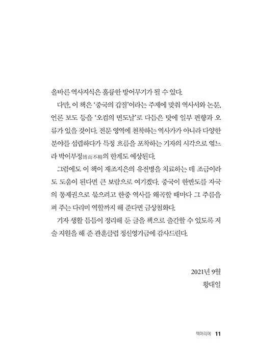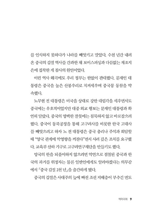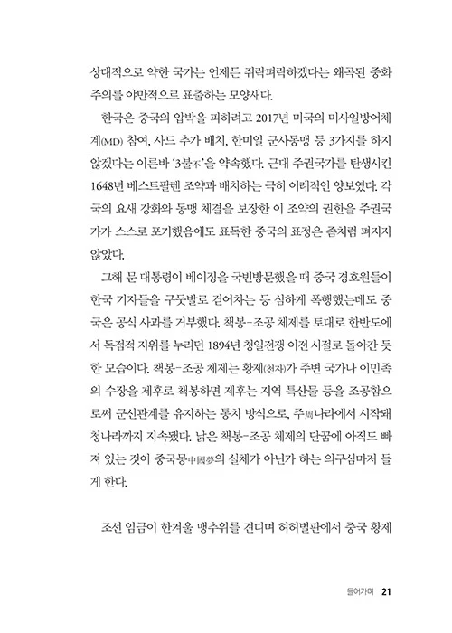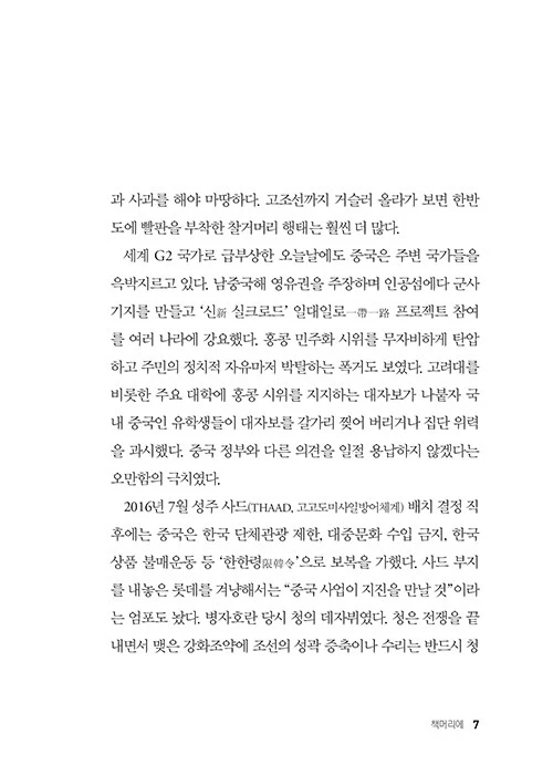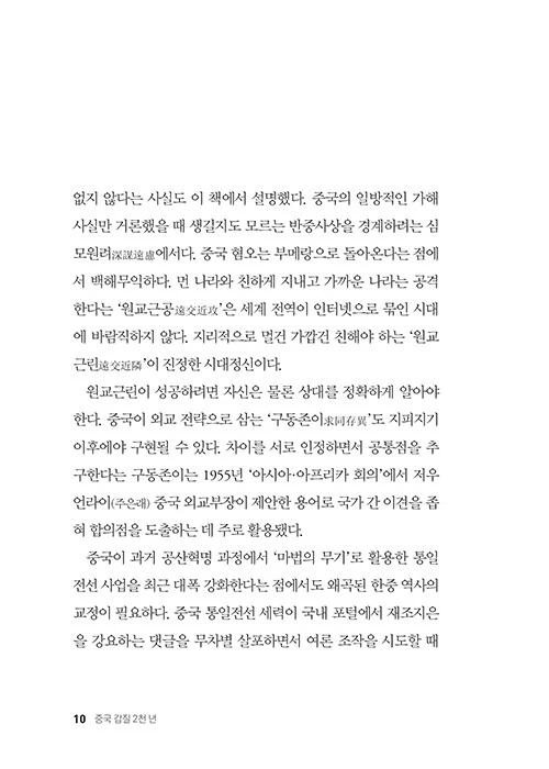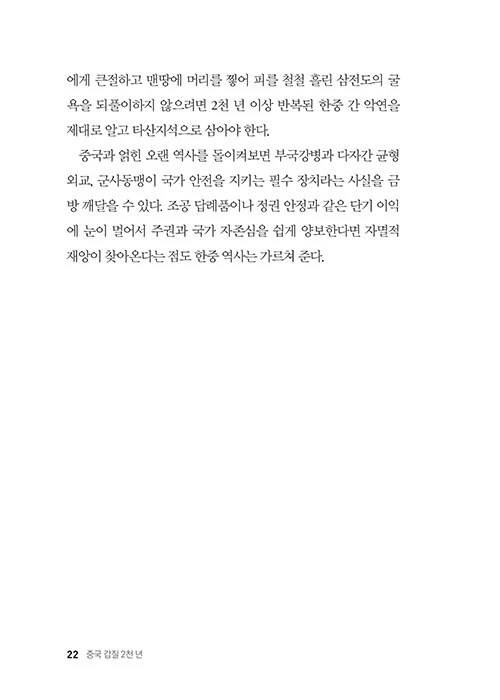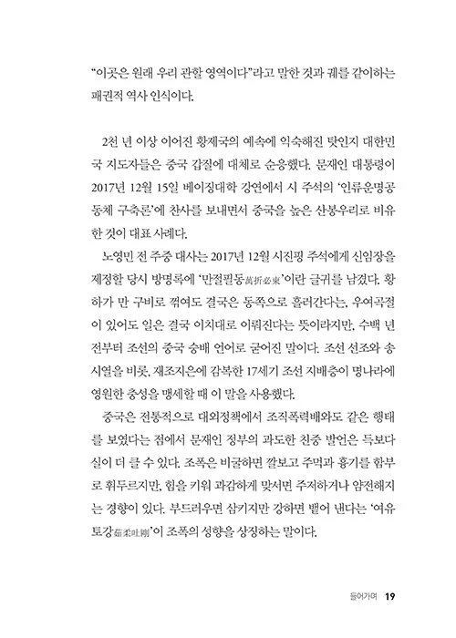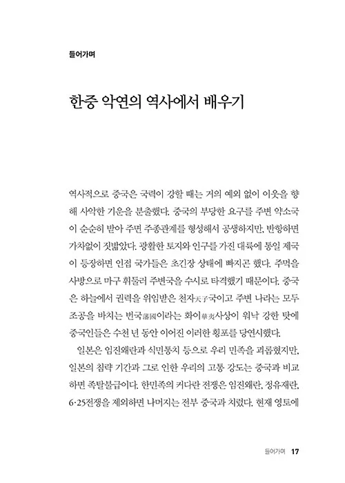 G1 패권을 꿈꾸는 ‘시황제’ 시진핑의 시대에 문재인 정부의 과도한 친중 자세는 득보다 실이 더 클 수 있다. 다만, 필요 이상의 반중(反中)과 혐중(嫌中)은 부메랑으로 돌아올 수 있어 백해무익하다는 조언 또한 책은 빼놓지 않는다. 역사 속 중국의 갑질 행태를 되돌아본 이 책이 한갓 역사서가 아니라 미래를 위한 교훈서로 읽히는 이유다.