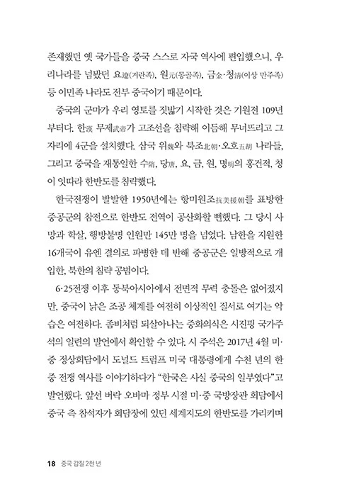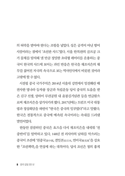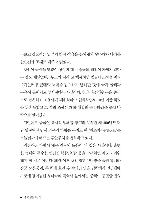 미국과 더불어 세계 G2 국가로 급부상한 오늘날에도 중국은 주변 국가들을 윽박지르고 있다. 한국에 대해서도 400년 전 ‘재조지은(再造之恩)’을 또다시 내세우며 ‘친중반미’를 압박하고 있다.