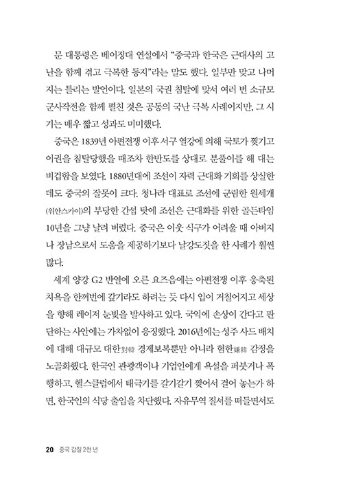 중국은 1839년 아편전쟁 이후 서구 열강에 의해 국토가 찢기고 이권을 침탈당했을 때조차 한반도를 상대로 분풀이를 해 대는 비겁함을 보였다. 1880년대에 조선이 자력 근대화 기회를 상실한 데도 중국의 잘못이 크다. 청나라 대표로 조선에 군림한 원세개(위안스카이)의 부당한 간섭 탓에 조선은 근대화를 위한 골든타임 10년을 그냥 날려 버렸다.
