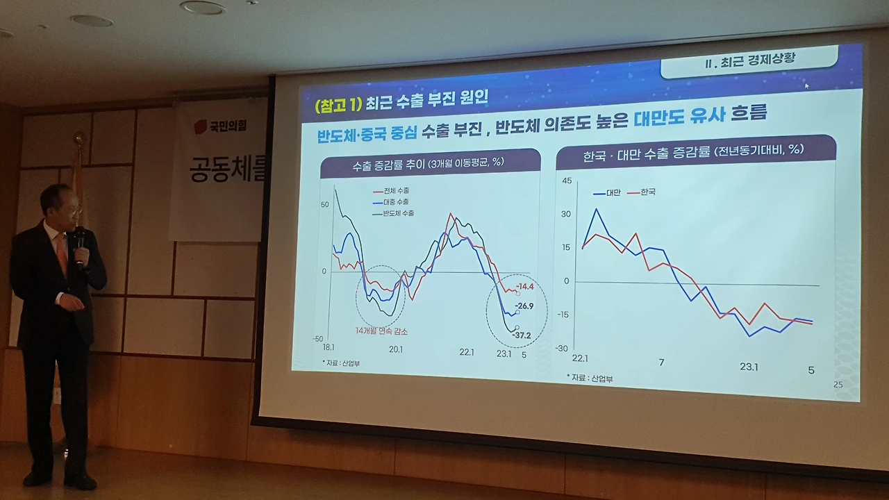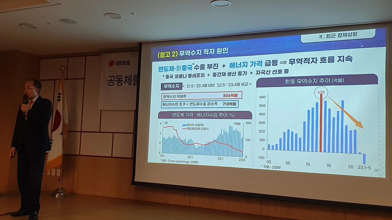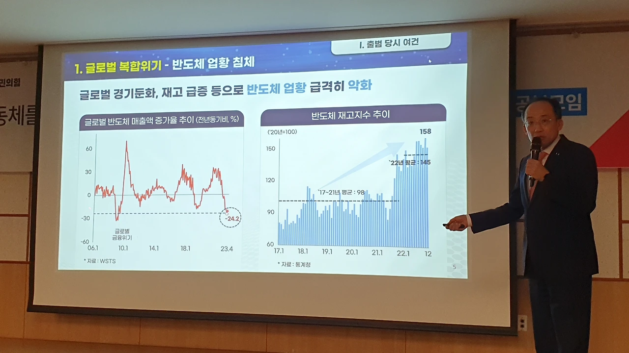 추 부총리는 수출 부진의 원인을 반도체 분야 시장 구조 문제로 진단하고 “그 근본적 구조, 중국 편향적인 수출 구조를 바꾸고, 특정 국가·품목에 편향된 구조를 바꾸기 위해서 윤 대통령이 선두에 뛰고 있는 것”이라고 말했다.