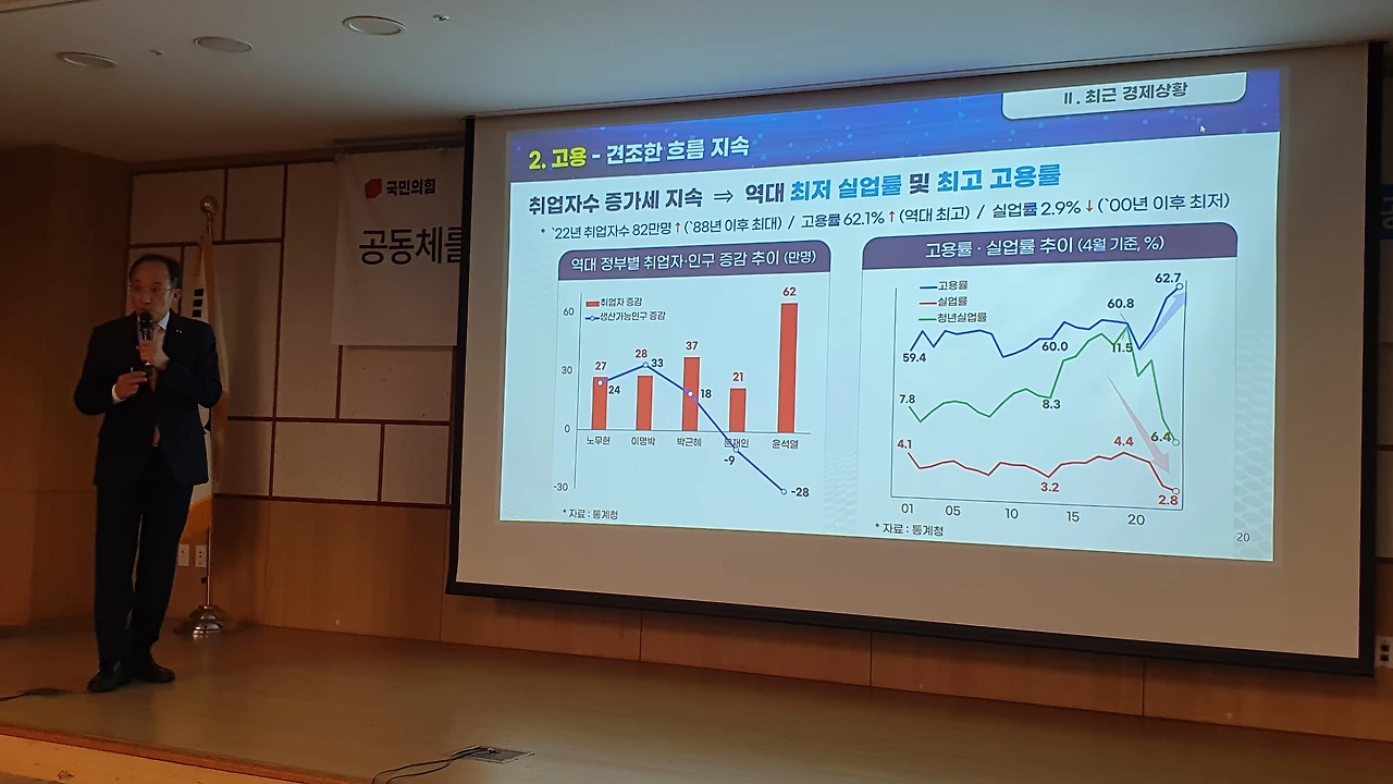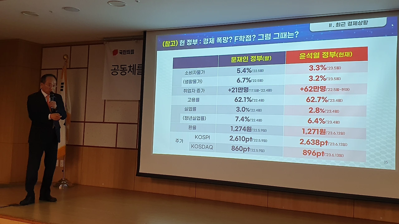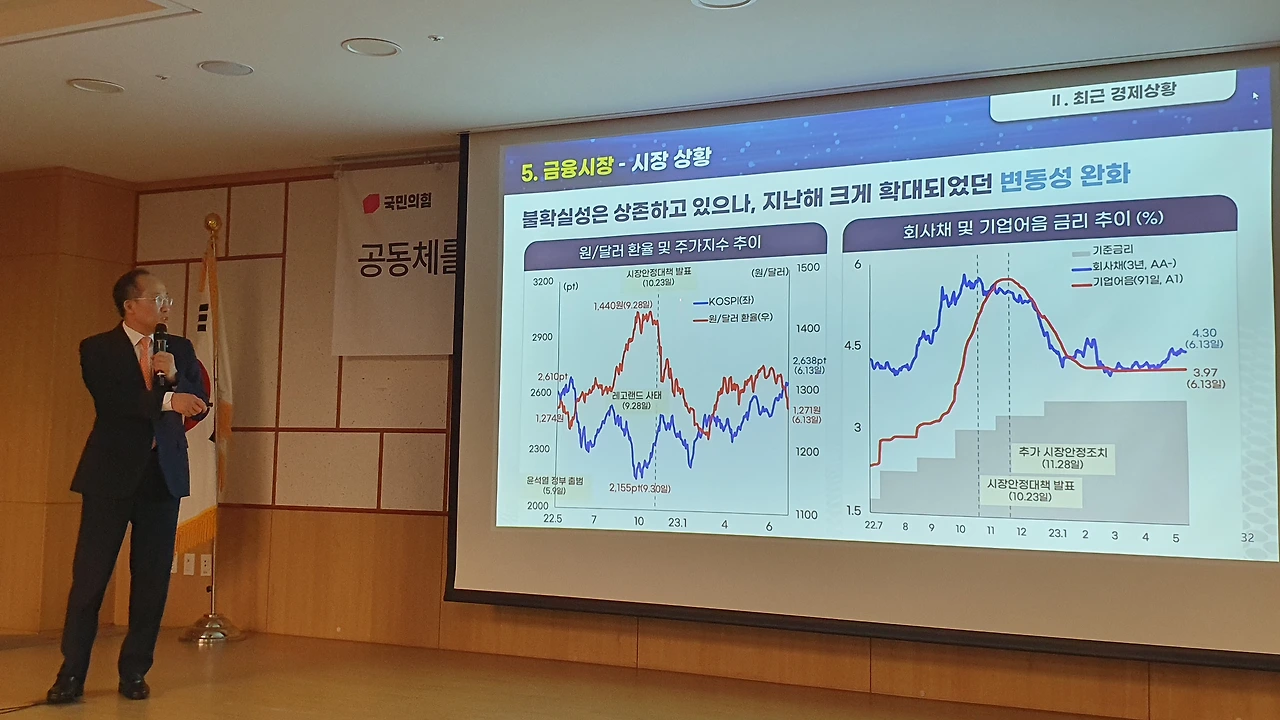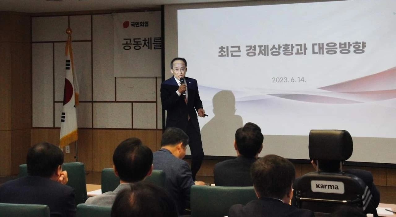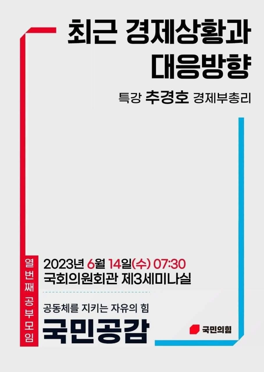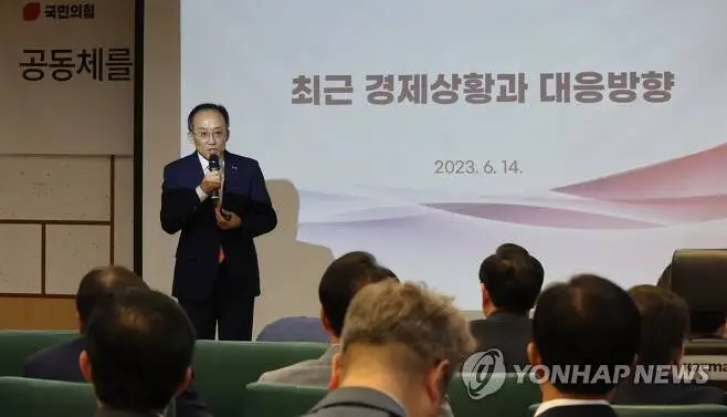추경호 부총리 겸 기획재정부 장관이 6월 14일 국민의힘 친윤(친윤석열) 공부모임 ‘국민공감’에서 윤석열 정부의 각종 경제 지표가 문재인 정부 때보다 나아지고 있다며 여당 의원들에게 ‘자신감 있는 대응’을 독려했다.