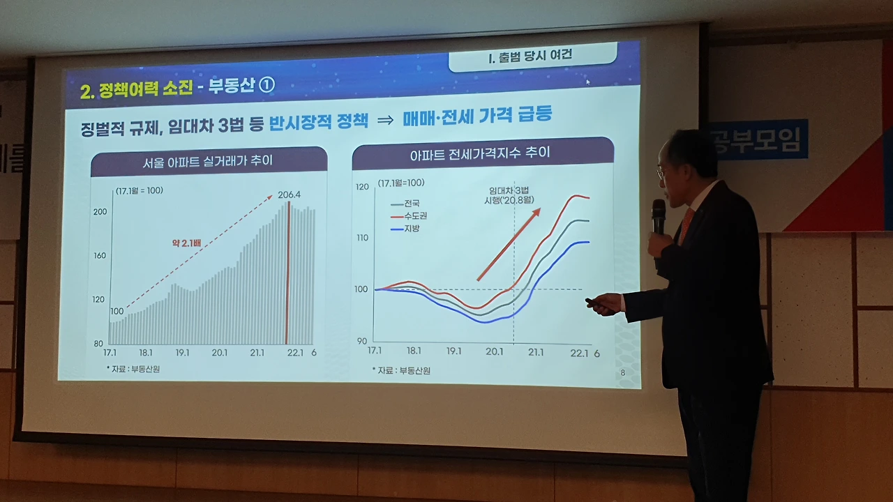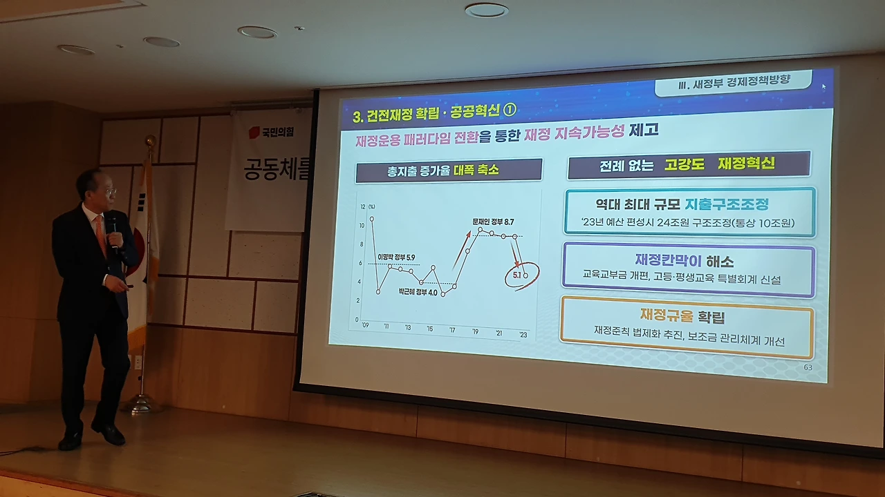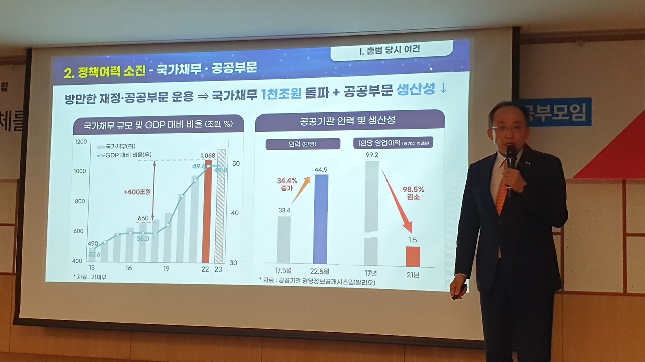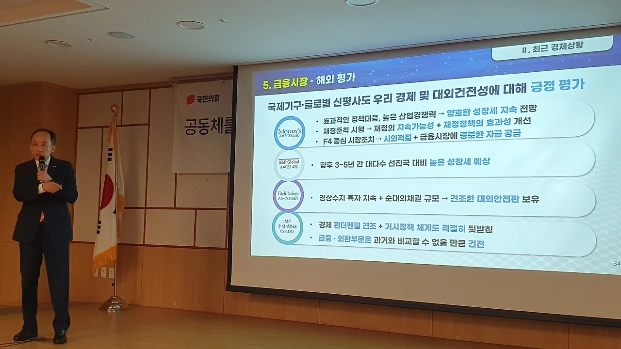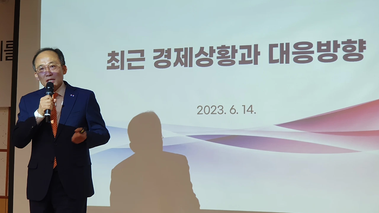 추 부총리는 이날 국회 의원회관에서 열린 국민공감 특강에서 윤석열 정부와 문재인 정부의 경제 지표를 비교하며 “지금 우리 경제를 폭망이라고 하면서 ‘F 학점’이라고 말하는데, 경제는 객관적으로 이야기를 해야 한다”고 지적했다.