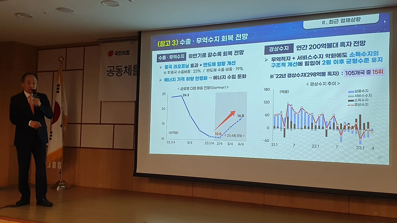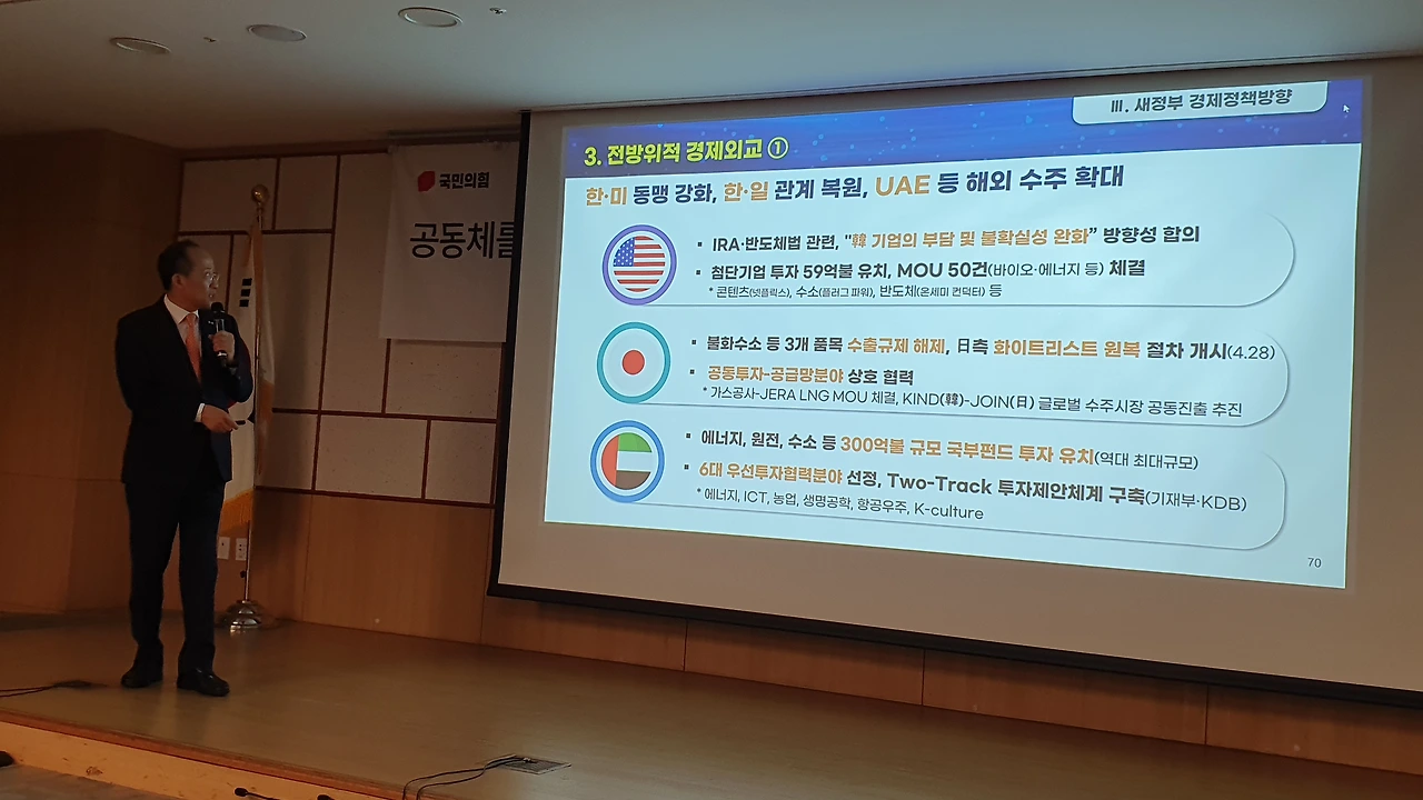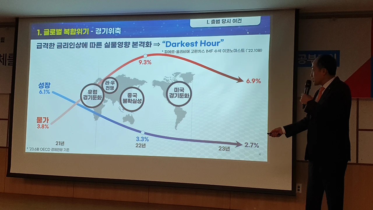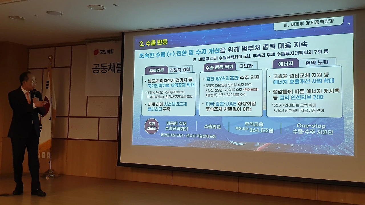 특히 “여러분은 ‘하반기에 가면 좀 나아질 텐데, 특히 내년 초에 나아져야 하는 것’ 아니냐고 생각할 텐데, ‘친정 왔다고 뻥튀기하네’라고 할 수도 있다”는 농담을 곁들이며 자신의 전망이 국내외 국책 연구기관의 공통된 전망이라고 강조했다. 추 부총리는 ‘1호 영업사원’으로 나선 윤석열 대통령의 활약도 설명했다.
