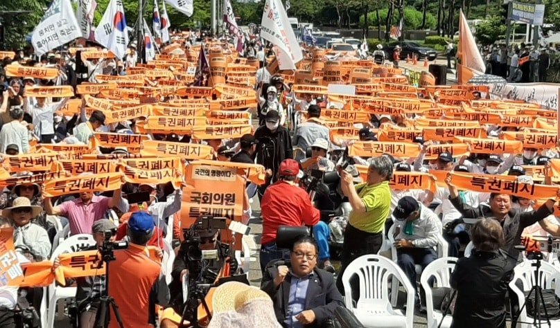 그러면 대한민국 현실과 미래 비전에 어울리지 않고 오로지 적대적 진영정치에 매몰되어 있는 정치권의 고질병을 어떻게 치유할 수 있을 것입니까. 바로 정치권력에 따르는 이권 곧 특권을 떼어놓을 때 가능하다고 봅니다. 마침 지난 5월 31일 장기표 선생이 대표로 있는 특권폐지국민운동본부 주도 하에 국회의원특권폐지 촉구 국회의사당 인간띠 둘러싸기 행사가 여의도에서 펼쳐졌습니다. 궁극적으로 국회의원이라는 권력에서 각종 특권을 없이해야 정치가 정상화된다는 요구였습니다.