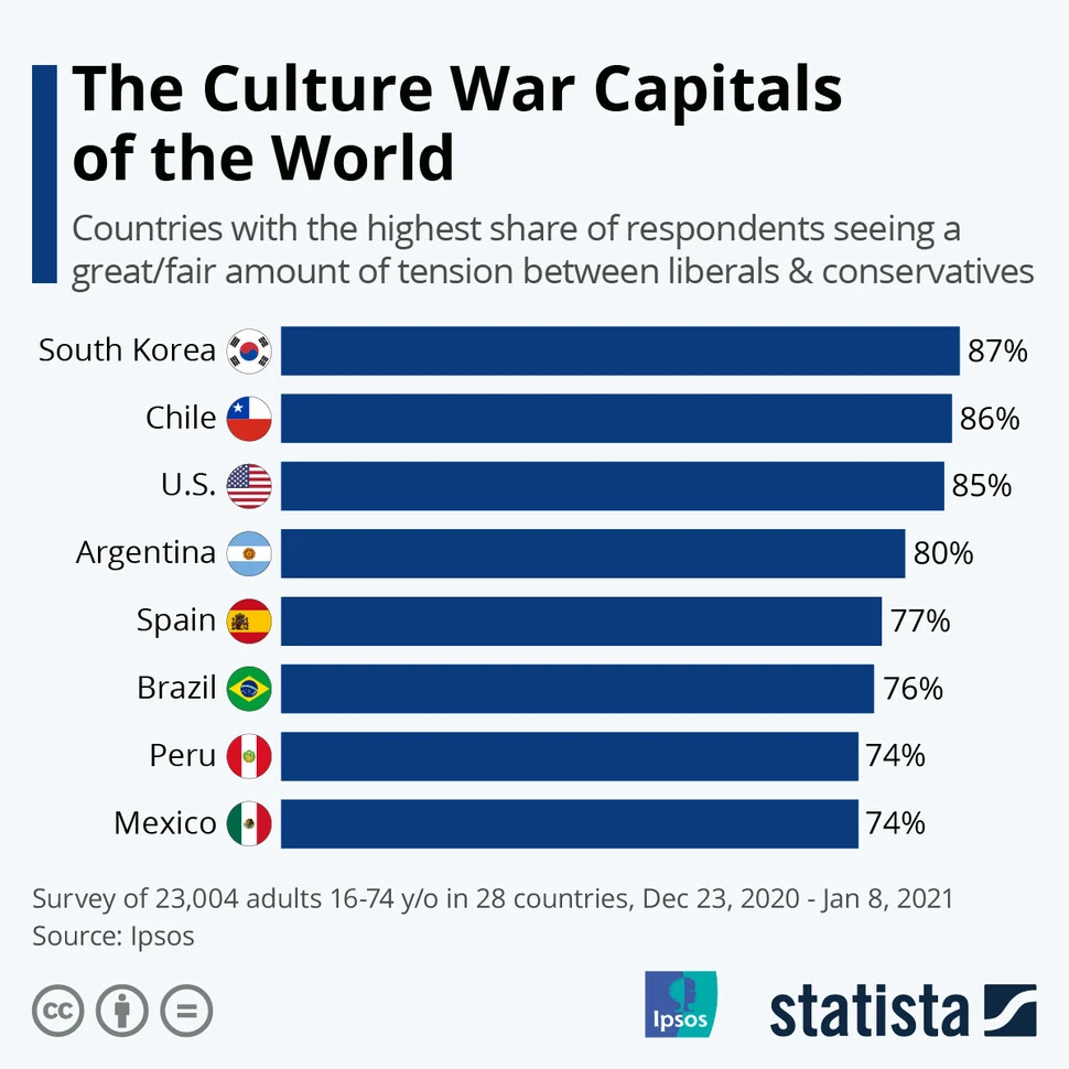이러한 정치 현실이 사회 갈등의 원천이 되고 있음은 말할 나위도 없습니다. 지난 2021년 6월, 영국 명문대 킹스 컬리지(King's College)에서 여론조사기관 입소스(Ipsos)에 의뢰해 발간한 보고서에서 한국은 ‘갈등지수 세계 1위 국가’로 명시되었습니다. 전세계 28개국의 시민 2만8천여 명을 대상으로 빈부격차, 지지정당, 정치 이념 등 12개 갈등 항목에 대해 얼마나 심각하다고 느끼는지를 조사했는데, 우리나라 경우 이념·정당·빈부·세대·성별·학력·종교 등 7개 갈등 항목에서 ‘심각하다’고 응답한 것으로 나타났습니다.
