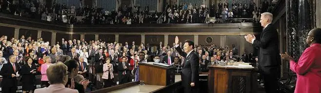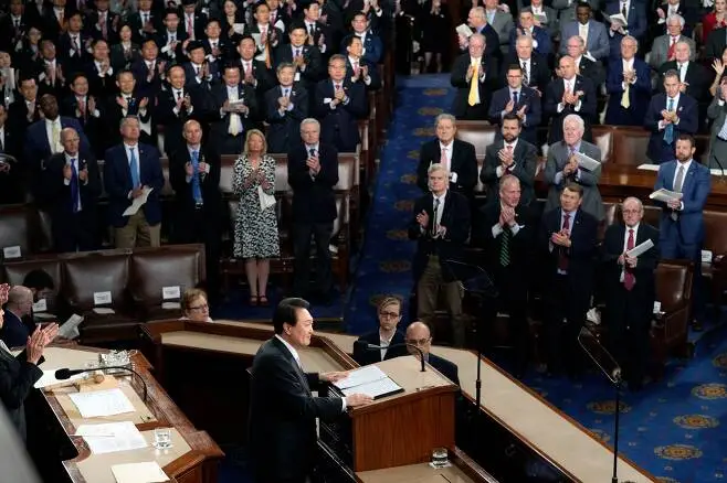 윤석열 대통령이 2023년 4월 27일(현지 시각) 미국 워싱턴 DC 의회의사당에서 상·하원 합동 연설을 마친 직후 의원들의 기립 박수에 오른손을 들어 올려 화답하고 있다.