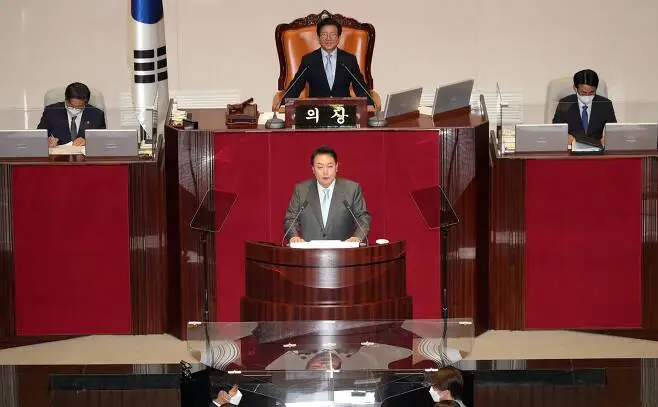 윤석열 대통령이 2022년 5월 16일 서울 여의도 국회 본회의장에서 코로나19 손실보상을 위한 추가경정예산안 시정연설을 하고 있다./대통령실사진기자단