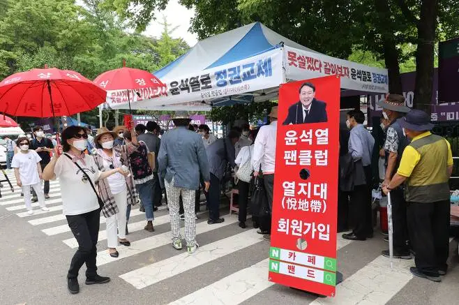윤석열 팬클럽 회원들이 2021년 6월 29일 서울 서초구 매헌 윤봉길 의사 기념관에서 열릴 윤석열 전 검찰총장의 대선 출마 기자회견장 앞에서 회원 가입을 진행하고 있다./조선일보