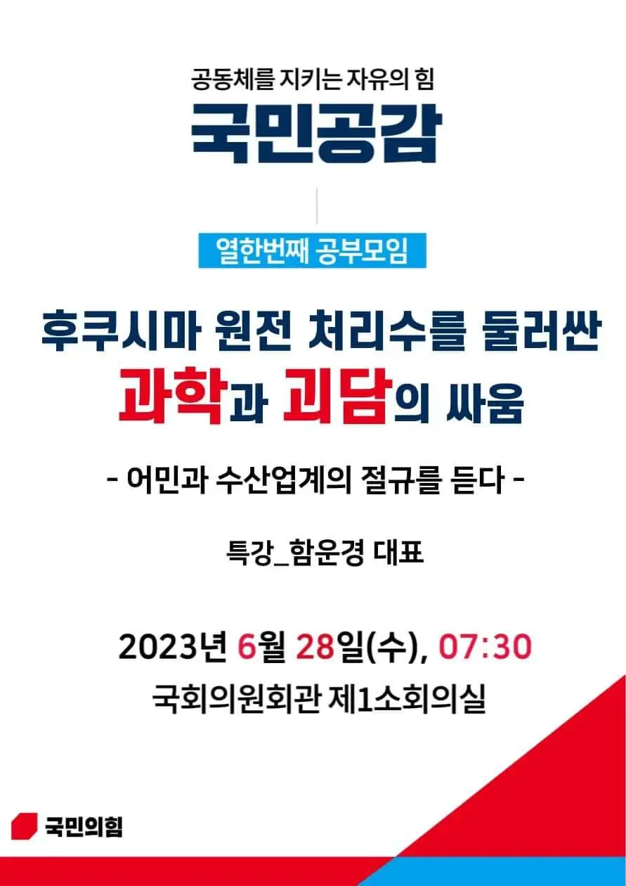 1980년대 운동권의 핵심이었고 현재는 군산에서 횟집을 운영하는 함운경 씨가 "오염수 괴담은 반일감정을 자극해 이득을 보려는 것"이라고 했다. 함 씨는 28일 국민의힘 공부모임 '국민공감'이 국회에서 개최한 강연에 강사로 나서 "방류수(오염수) 문제는 과학과 괴담의 싸움을 넘어 국내 반일감정을 부추기겠다는 명백한 의도를 갖고 시작한 싸움"이라며 더불어민주당이 오염수(원전처리수) 방류를 문제 삼는 것은 정치적 목적을 가진 선전활동의 일환이라고 규정했다. 함 씨는 1985년 미 문화원 점거 사건을 주도한 운동권의 상징적 인사다. 민주당의 오염수 괴담으로 수산물 소비가 줄면서 피해를 보고 있는 피해당사자이기도 하다.