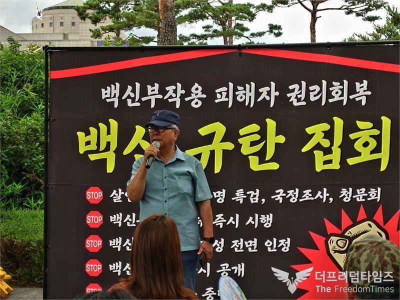 지난 7월 8일 용산 전쟁기념관 조형물 앞에서 열린 백신부작용 피해자 권리회복 백신 규탄 집회에서 연설하는 코로나19진상규명시민연대 김두천 대표 (사진=더프리덤타이즈)