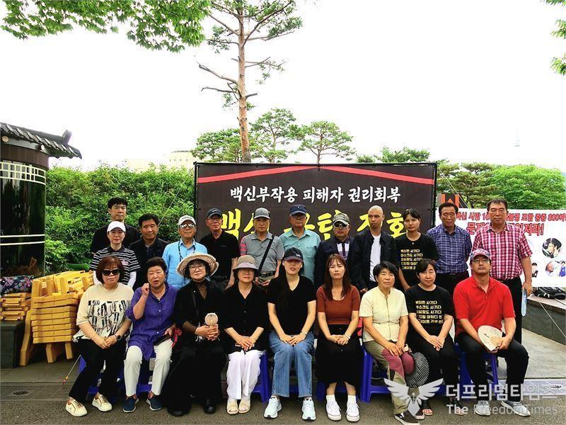 지난 7월 8일 용산 전쟁기념관 조형물 앞에서 열린 제17차 백신부작용 피해자 권리회복 백신규탄 집회 모습 (사진=더프리덤타임즈)
