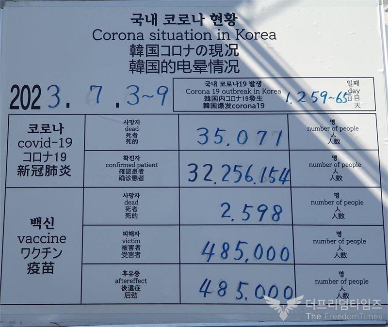 코로나19백신부작용 희생자 합동분향소 입구에 놓여있는 코로나19 피해자 현황판 (사진=더프리덤타임즈 제공)
