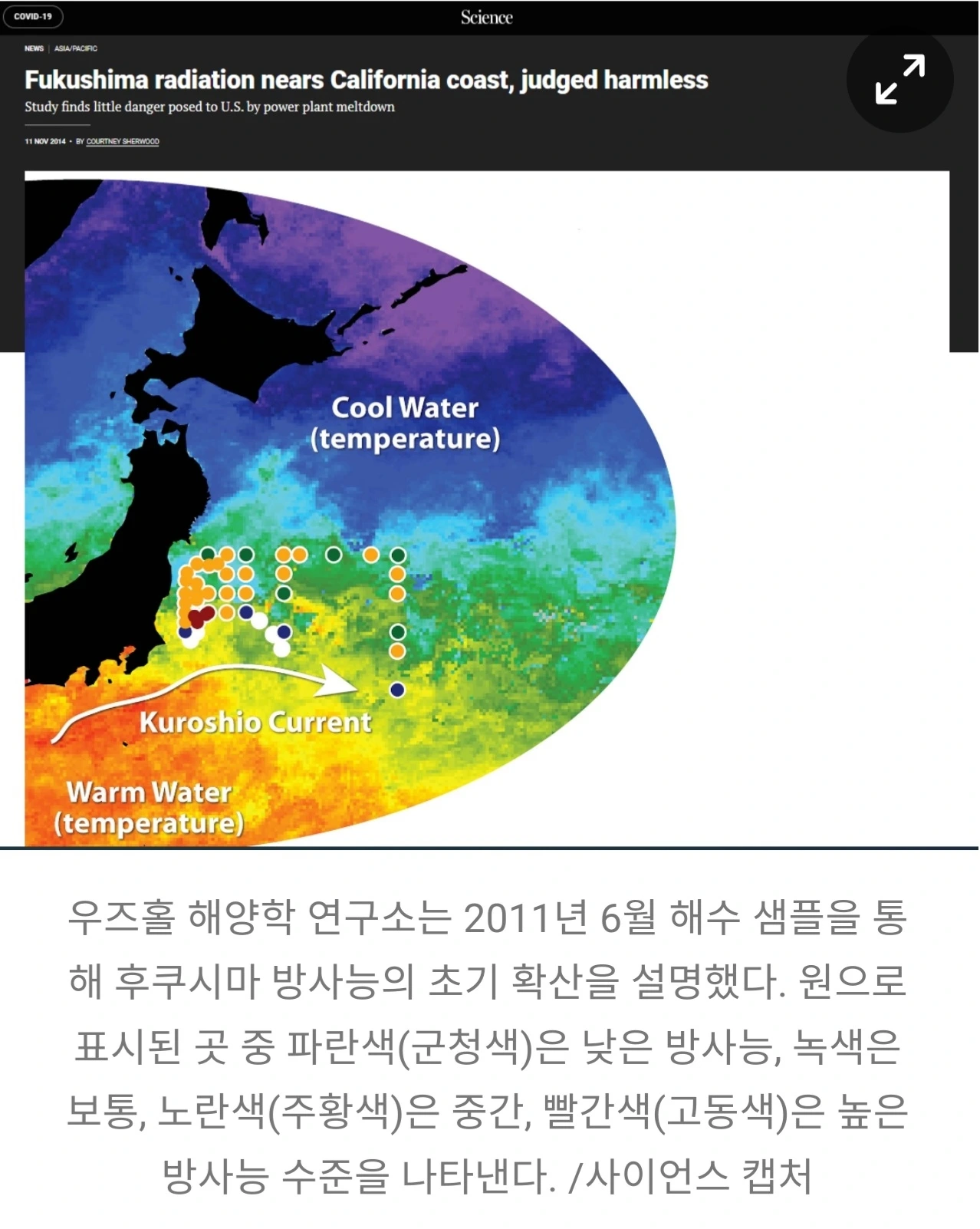 미국과학진흥협회에서 발행하는 과학 전문 주간지 ‘사이언스(Science)’에는 “연구 결과 (후쿠시마) 발전소 붕괴로 인한 미국 내 위험은 거의 없다고 밝혀졌다”는 내용의 기사가 2014년 11월 11일 ‘캘리포니아 해안 근처의 후쿠시마 방사능, 무해한 것으로 판명됨’이라는 제목으로 게재됐다.