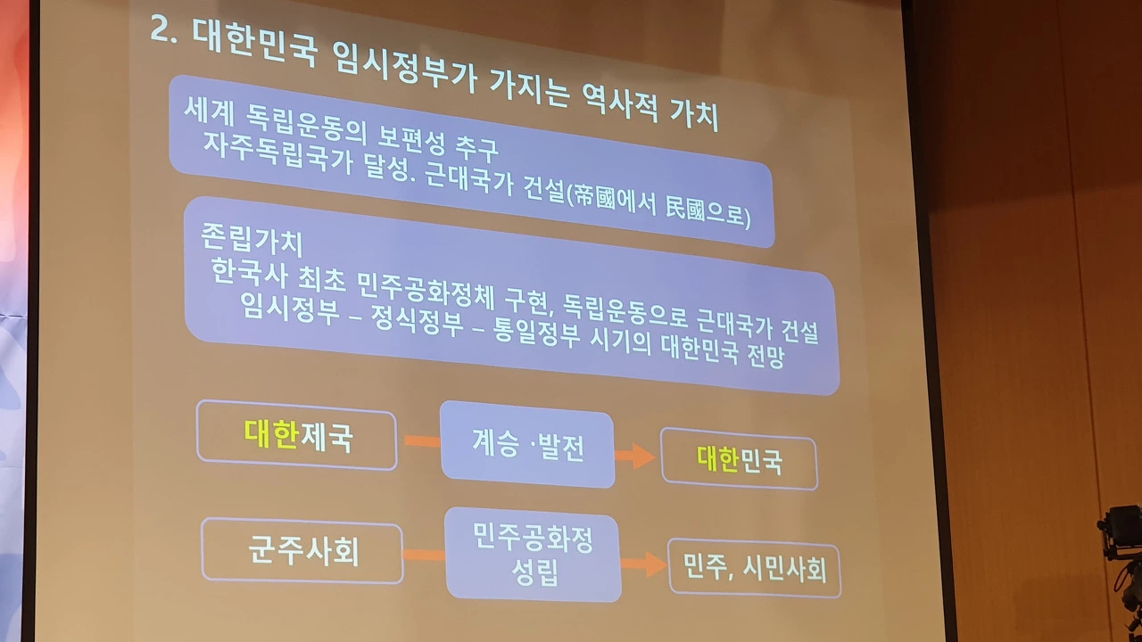 이어 "광복회는 1919년을 원년이라고 할 뿐"이라며 "없었던 신생국이 태어났다가 아니고 '민주공화국'으로 체제가 변화했다는 것이 정확하다. 민주공화국을 선택했고 국가가 건국된 것이 아니라 민주공화국이라는 체제의 대한민국이 탄생했다는 것"이라고 설명했다.