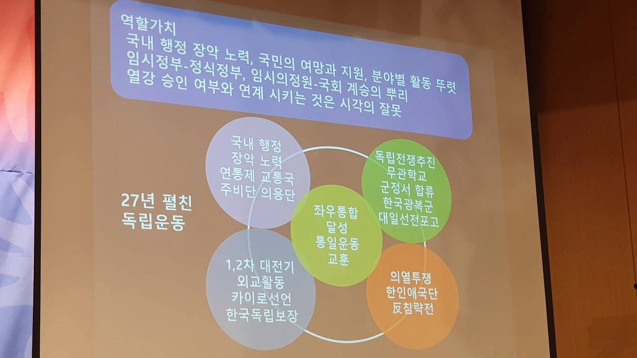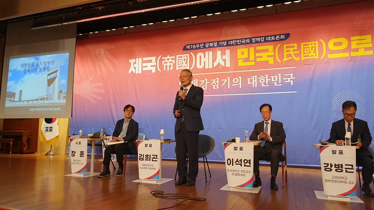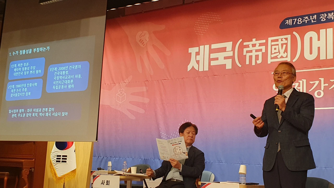 대한민국 건국 정통성 논쟁은 북한 정권이 앞장서서 주도했다는 해석도 나왔다. 이날 발제자로 나선 김희곤 국립대한민국임시정부기념관장은 "북한은 한반도에서 배타적이고 독점적인 정통성을 주장하고 나섰는데, 거기엔 임정에 대한 극단적 비판이 깔려있었다"며 "이 전 대통령부터 대한민국 정부가 임정을 계승한다는 사실을 천명했기 때문"이라며 “김일성 우상화, 항일투쟁사 왜곡 등을 갖다 붙인 이유”라고 밝혔다. 김 관장은 또 지난 1980년대 일부 진보 성향 역사학자들 중심으로 제기된 민중사학에 대해 “대한민국 임시정부를 짓밟는 북한의 논리를 계승했다”며 “유신정권, 군사정권이 배타적인 정통성을 주장하는 방편으로 임시정부를 부각하자 이에 맞서 임시정부의 역사와 가치를 짓밟고 나선 것”이라고 비판했다.