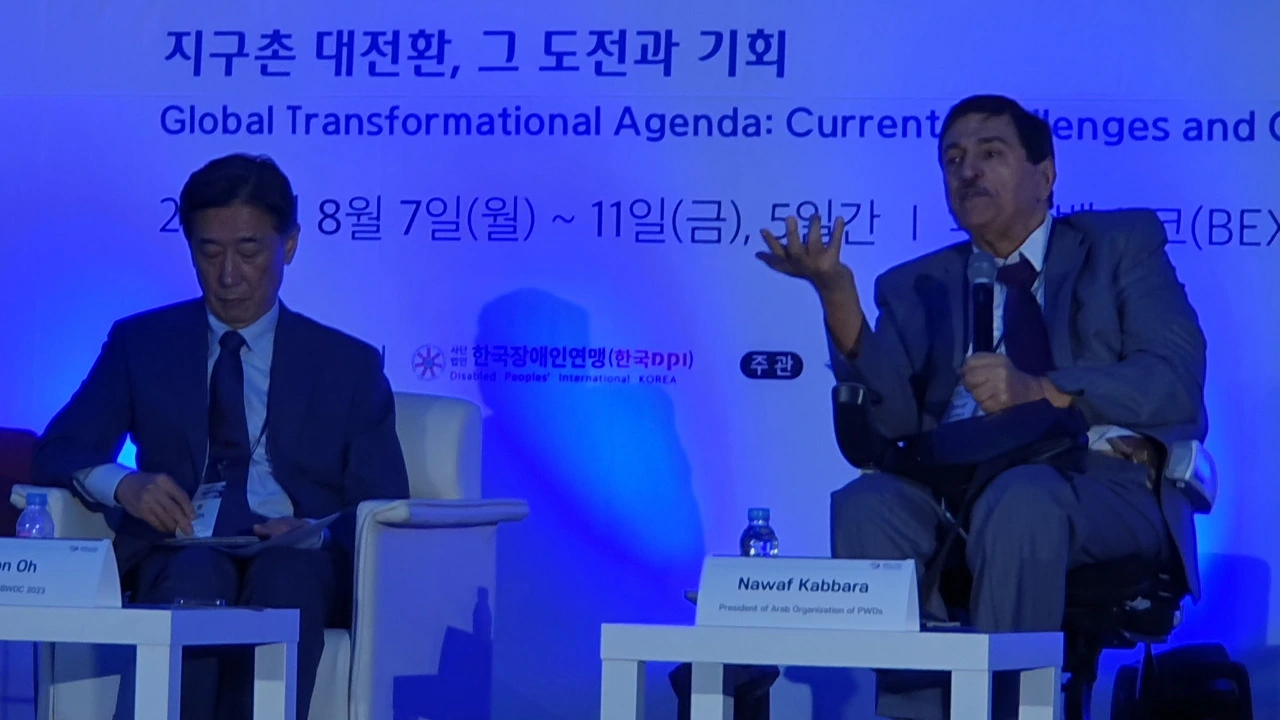 한국장애인연맹(DPI Korea)이영석 회장은 환영사를 통해 "우리는 지구촌 대전환, 그 도전과 기회 변화의 시대에 서 있다"면서 "과거와 달리 우리는 이제 준비되어 있고 연대하고 있다. 우리에게는 한 번도 경험해 보지 못했던 전 세계적 유행병과 세계 곳곳에서 장애인들의 생존과 기부 위기로 인해서 우리 장애인들의 생존과 존엄성이 위협받고 있지만, 그 반대로 과학기술과 인공지능의 발전으로 좀 더 다양한 모습으로 사회 참여를 가능하게 했다. 그 안에서 구분 없는 통합 사회를 꿈꾸며 더 많은 기회를 활용할 수 있는 기회가 되었다"고 말했다.