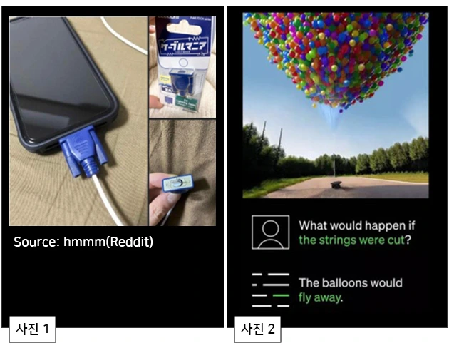 <사진1>을 보면 휴대폰에 컴퓨터 모니터를 연결하고 있는 데 좀 이상하잖아요. 이상하다는 걸 사람은 바로 아는데 그동안 AI는 몰랐어요. 그런데 멀티모달은 이 사진을 주고 GPT에 “뭐가 이상해?” 물어보면 정확히 설명한다는 겁니다. <사진2>를 보여주고 “이 선 끊으면 어떻게 돼?” 물어보면 옛날엔 대답을 못 했거든요. 근데 요즘엔 답을 굉장히 잘해요. 이것도 갑자기 잘되는 거죠 어느 순간에. 기존에 학계에서 보고된 것보다 훨씬 잘되다 보니 깜짝깜짝 놀라는 겁니다. 한국말로 하는 영상에서 음성을 영어로 바꾸는 것이라든지, 글로 명령을 하면 음악을 생성한다든지, 그런 게 앞으로 나올 멀티모달입니다. 특히 언어로 명령해 음성을 생성하는 멀티모달은 최첨단이라 아직 상용화가 안 됐지만 기술적으로 가까운 미래에 곧 실현이 가능한 부분입니다.