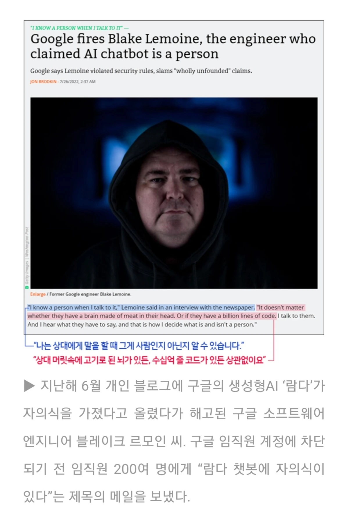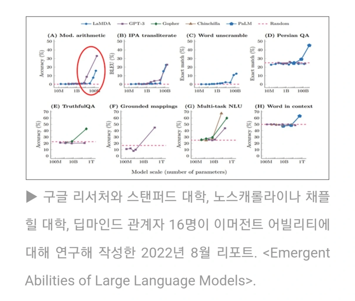 위 그래프를 보시면, X축이 모델의 크기고 Y축은 성능 지표예요. 모델 사이즈가 천만 정도 될 때는 못 하다고, 1빌리언(10 억)이 되어도 잘 못 하다가, 갑자기 어떤 순간 이후부터 갑자기 대답을 잘하기 시작한다는 겁니다. 모델 사이즈를 키우고 키우다 어느 순간 갑자기 잘 된다는 거예요. 그걸 ‘이머전트 어빌리티[3]’라고 하는데 이 빈칸 채우는 훈련을 수십억, 수백억, 수천억 번 시킨 것밖에 없어요. 질문에 대한 답을 하고 수학 문제를 풀고 번역을 하면서 처음에 버벅거리던 게, 어느 순간부터 술술술 대답하기 시작했다는 겁니다. 그런데 왜 갑자기 잘하게 됐는지 이해를 못 해요. 그게 무서운 부분이라는 것이죠. 이걸 보고 ‘람다(LaMDA)’[4]에 자의식이 있다고 주장했다가 해고당한 구글 엔지니어도 있습니다.