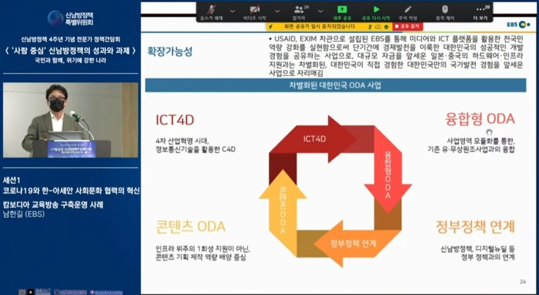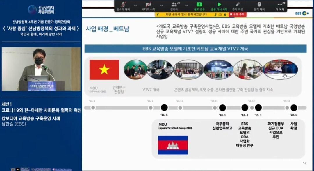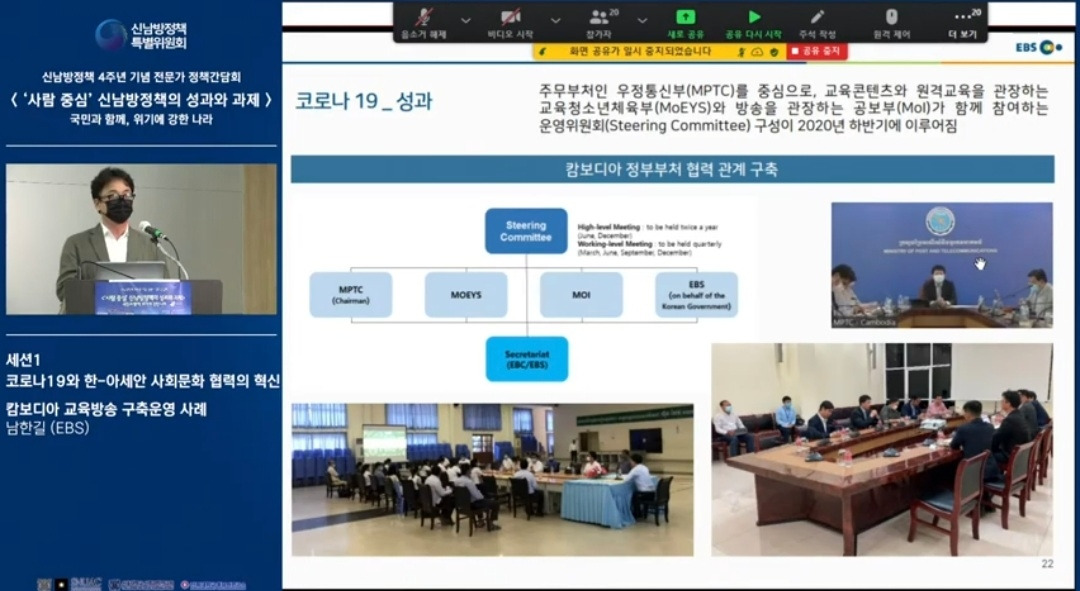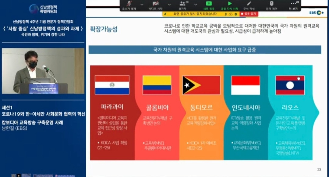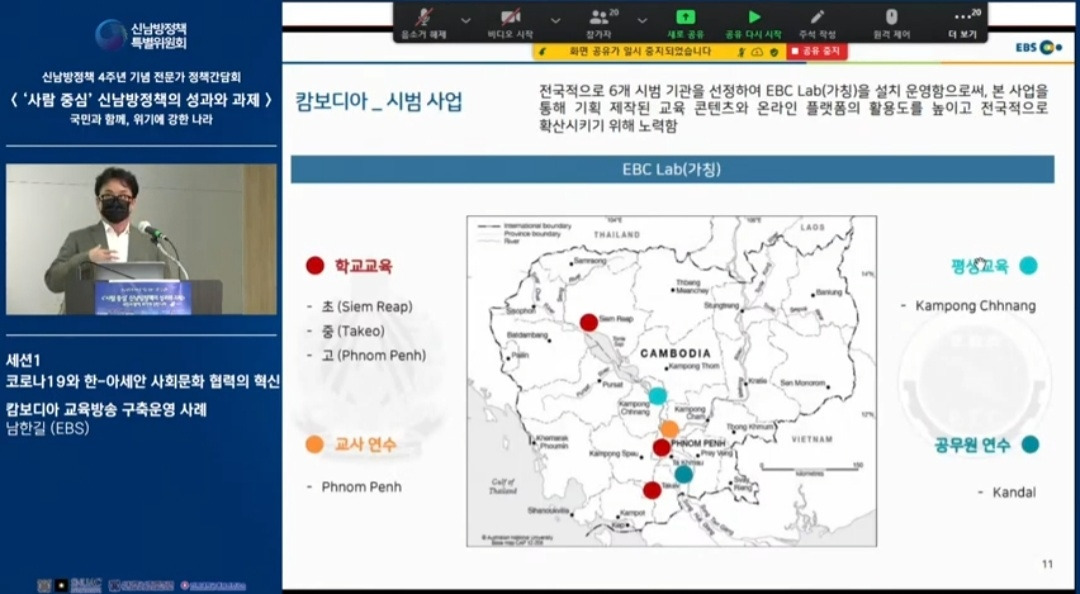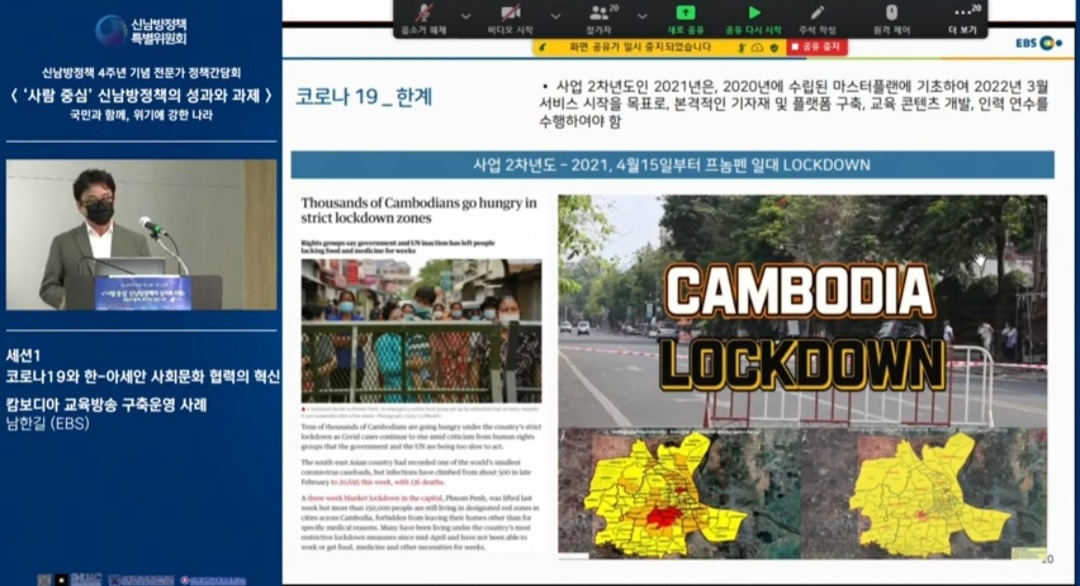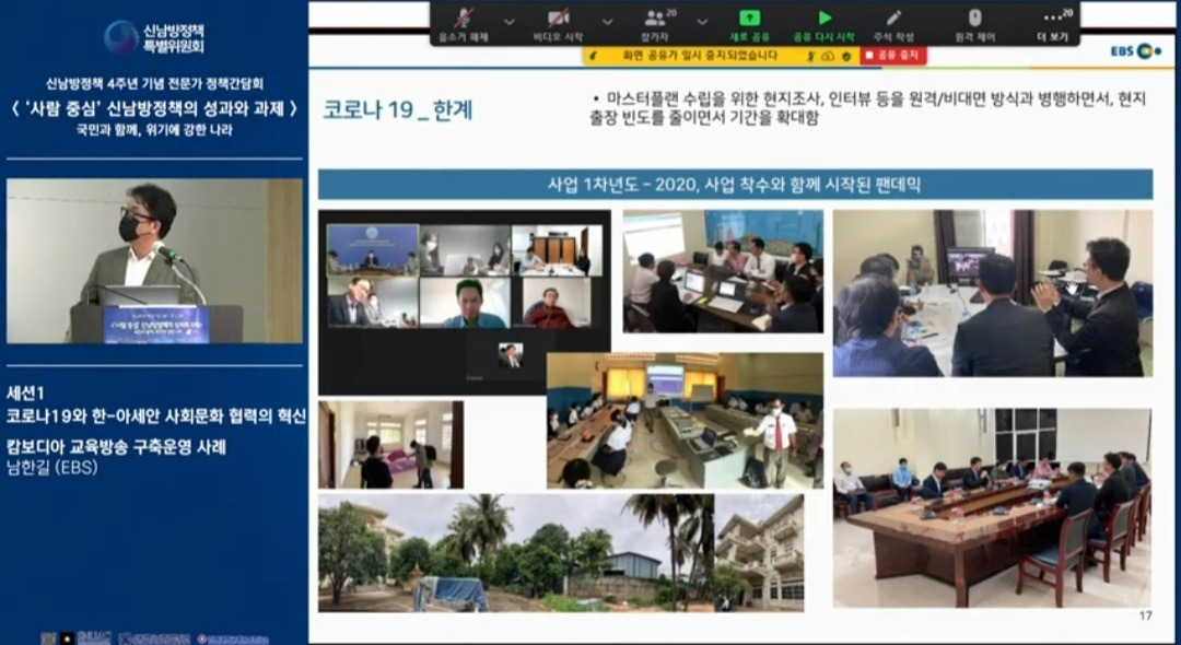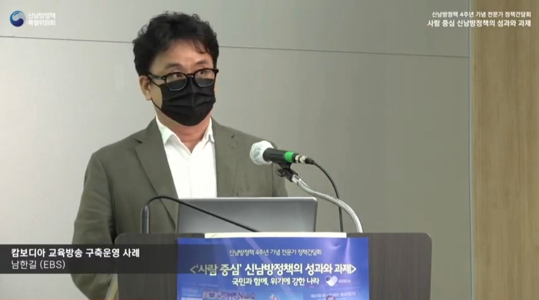 신남방정책 4주년 기념 전문가 정책간담회 '사람 중심' 신남방정책의 성과와 과제 2021.5.21. 오후2시. 서울대 아시아연구소 삼익홀(2F) - 오늘 발표 가운데 특히 내가 관심있게 본 것은 EBS가 캄보디아에 교육방송을 구축운영한 것이다. 나는 대한민국이 강대국이 되기를 진심으로 바라지만, 이제까지의 선진국이나 제국들과는 달리 '착한 강대국'이 되기를 갈망하고 있다. 말하자면 제3세계의 후진국들을 착취 수탈하는 그런 강대국이 아니라, 반세기 전만 해도 후진국이었던 올챙이 시절을 생각하면서 거들먹거리지 않고 그들에게 선한 영향력을 미치는 착하고 겸손한 강대국이 되어 인류문명에 새로운 비전을 제시하기를 바라는 것이다. 그것은 백범 김구 선생이 꿈꾼 문화강국의 실현이기도 하다.